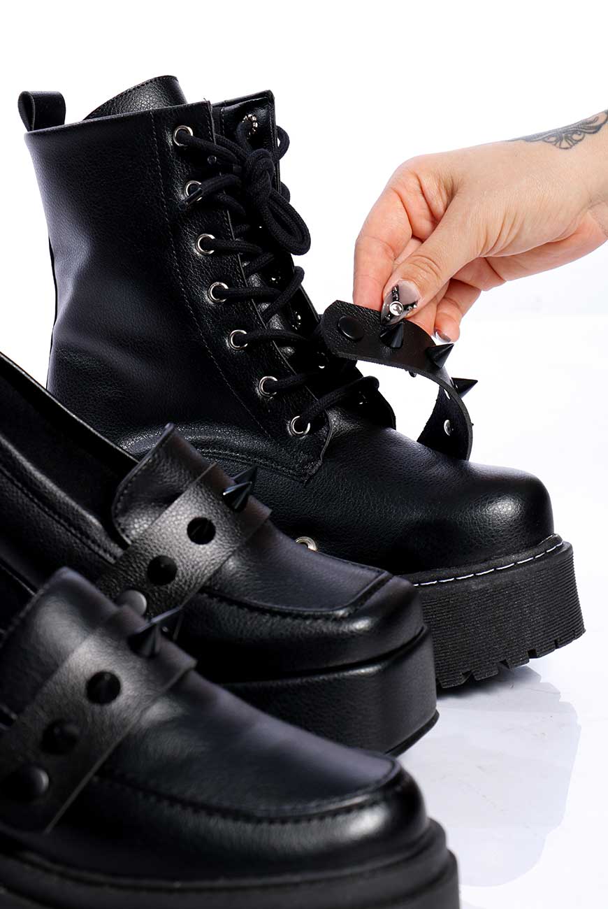 O Acessório Para Sapato Spikes Preto é produzido em napa sintética de origem não animal, conta com spikes pretos distribuídos nas tiras, trazendo muito peso e estilo para o seu visu.