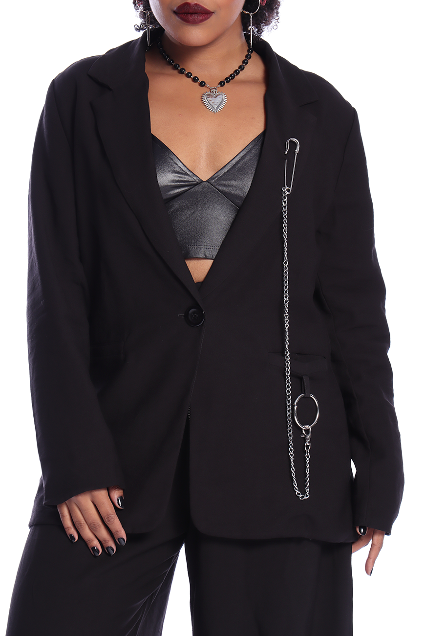 Além disso, possui o detalhe lindíssimo de argola fixada na aba do bolso esquerdo, com opção de corrente e alfinetes removíveis por mosquetão que trazem um peso incrível para a peça.