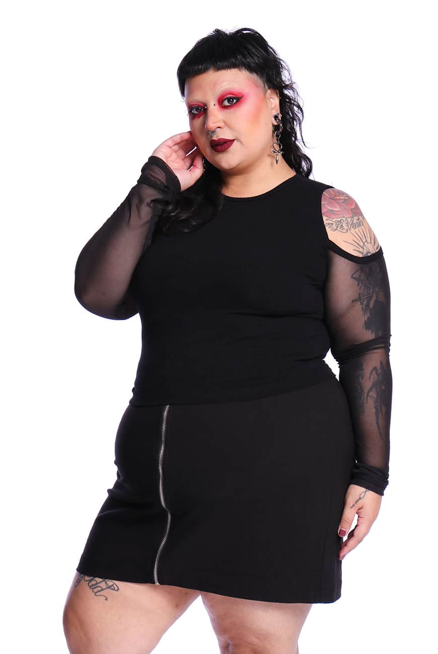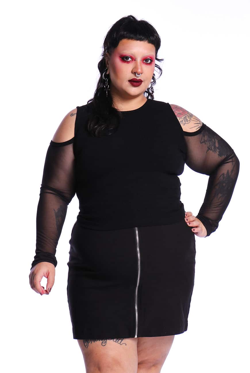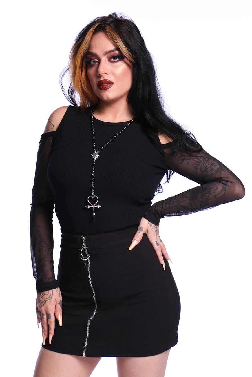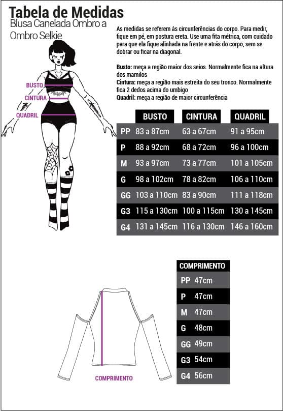 A Blusa Canelada Ombro a Ombro Selkie é produzida em uma malha canelada super macia, tem a modelagem justa, decote redondo e o detalhe lindíssimo de ombros de fora com mangas compridas de tule, trazendo um visual bem alternativo e estiloso!