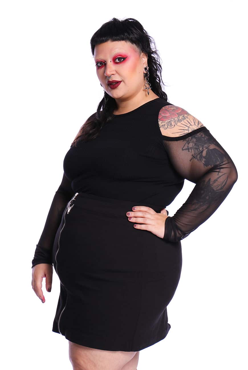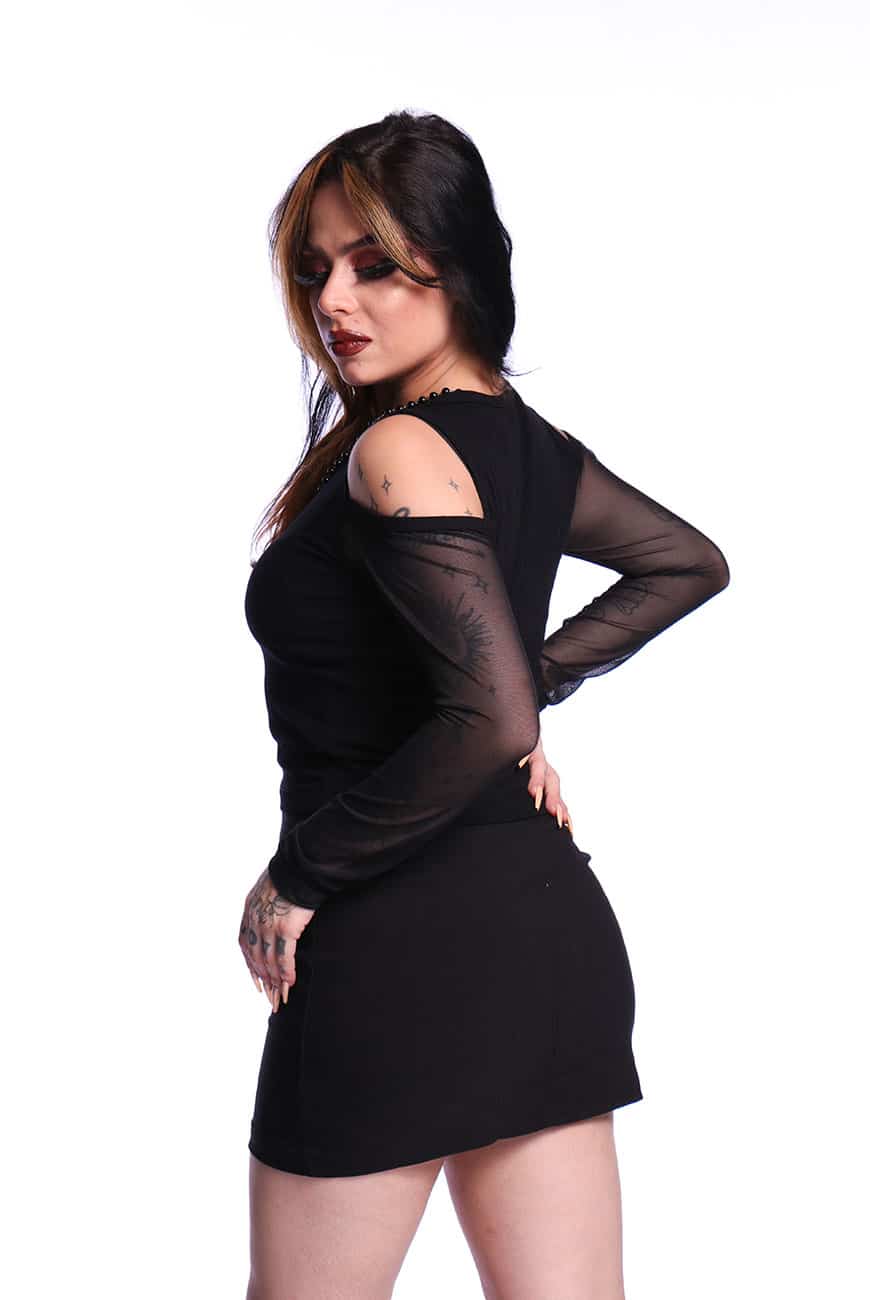 O tule das mangas é bem elástico e ajustado ao corpo, trazendo o efeito de transparência com muito conforto.