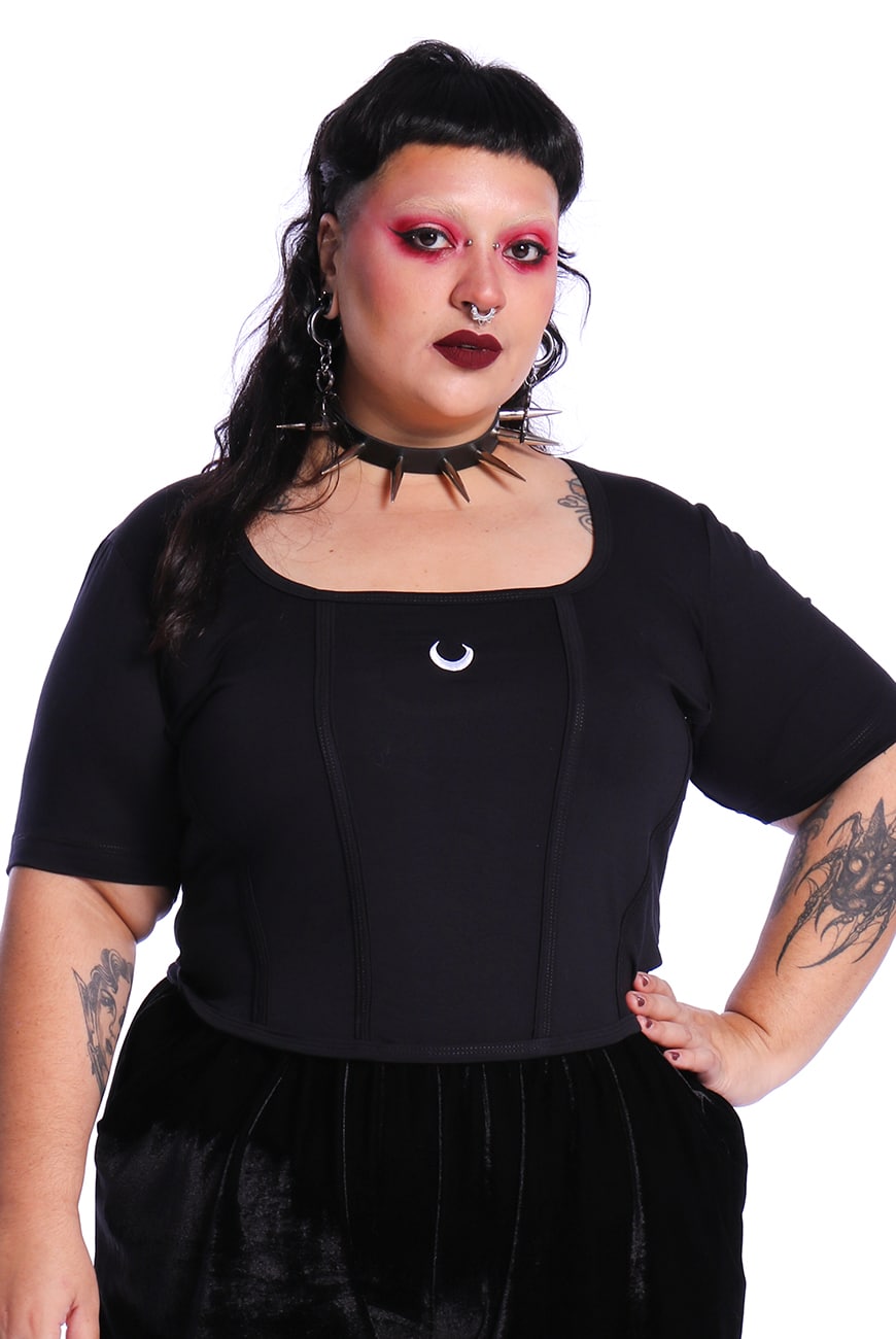 Tem mangas curtas e modelagem justa inspirada em um corpete, contando com detalhes como o decote quadrado, recortes e canaletas que alongam o centro da peça e acentuam a silhueta, trazendo esse ar mais vintage e sofisticado.