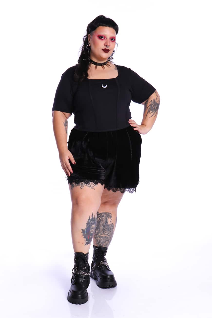 Dica de look: Use com o Shorts Veludo Preto Aura e Mocassim Pentagrama Ritual para um look romântico e casual.