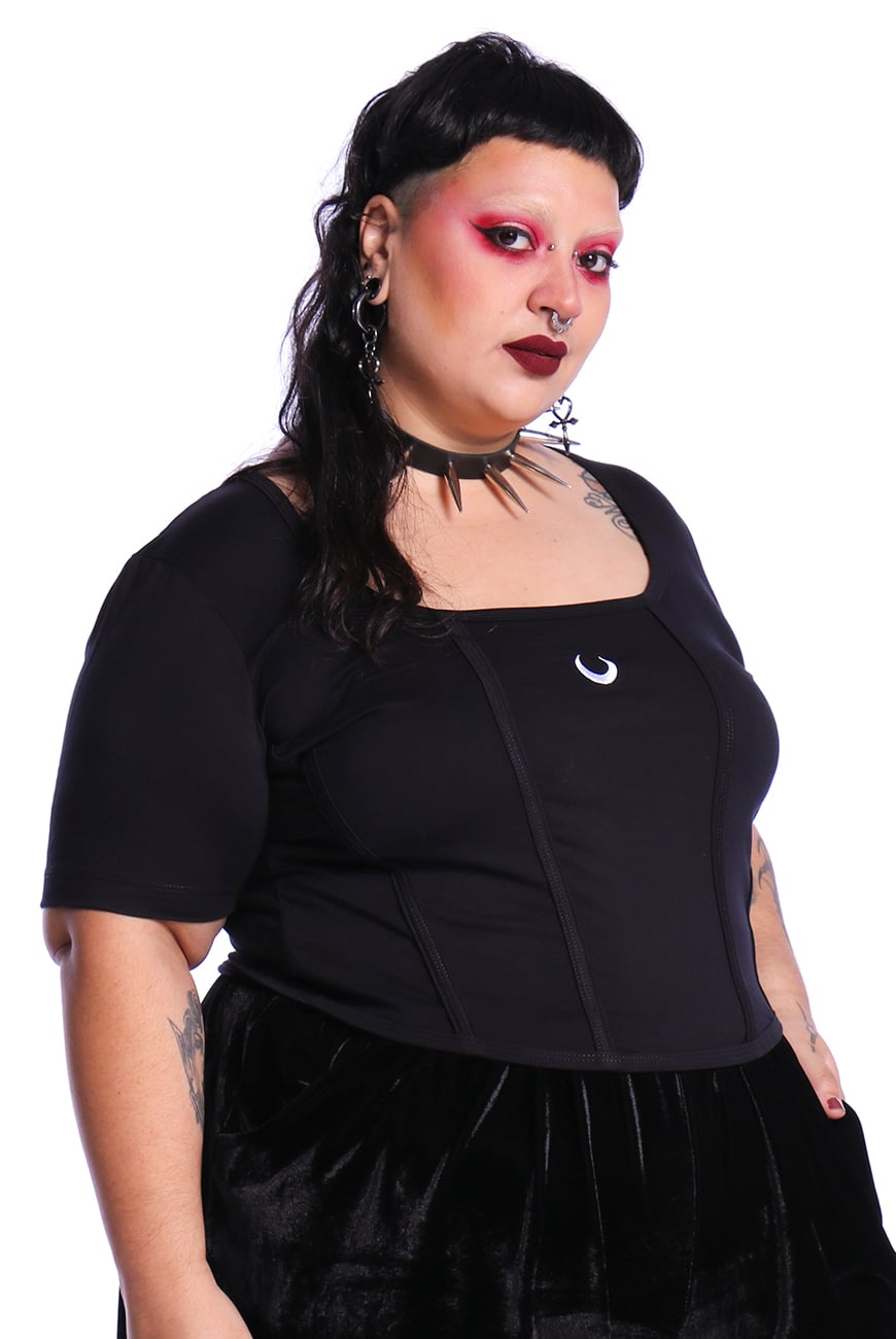A Blusa Corpete Preta Akasha é produzida em viscolycra de toque macio e confortável.