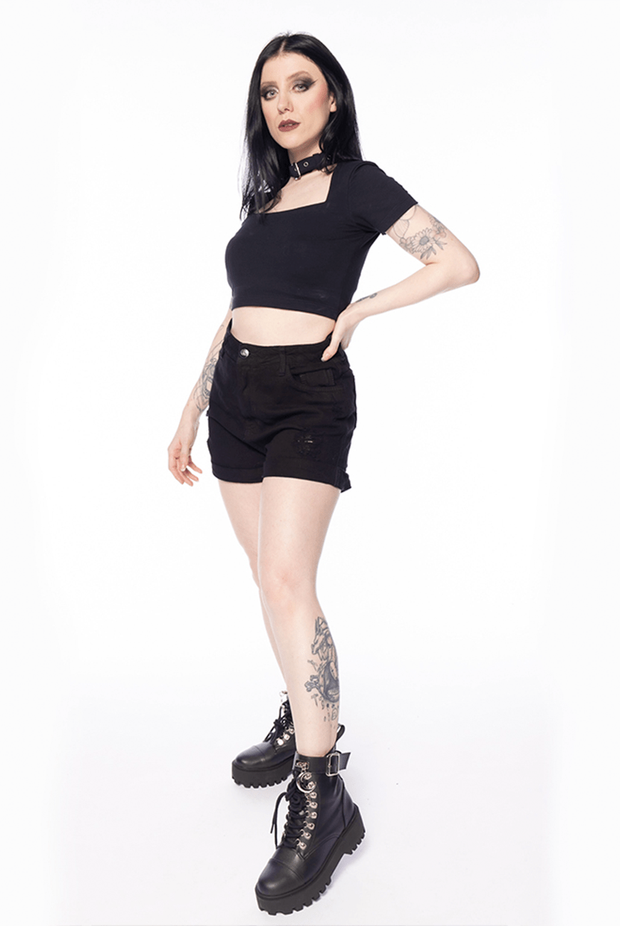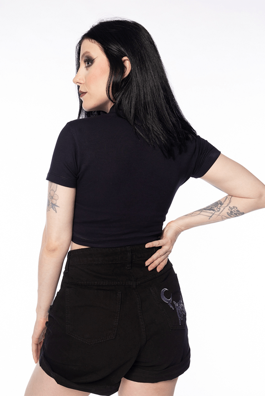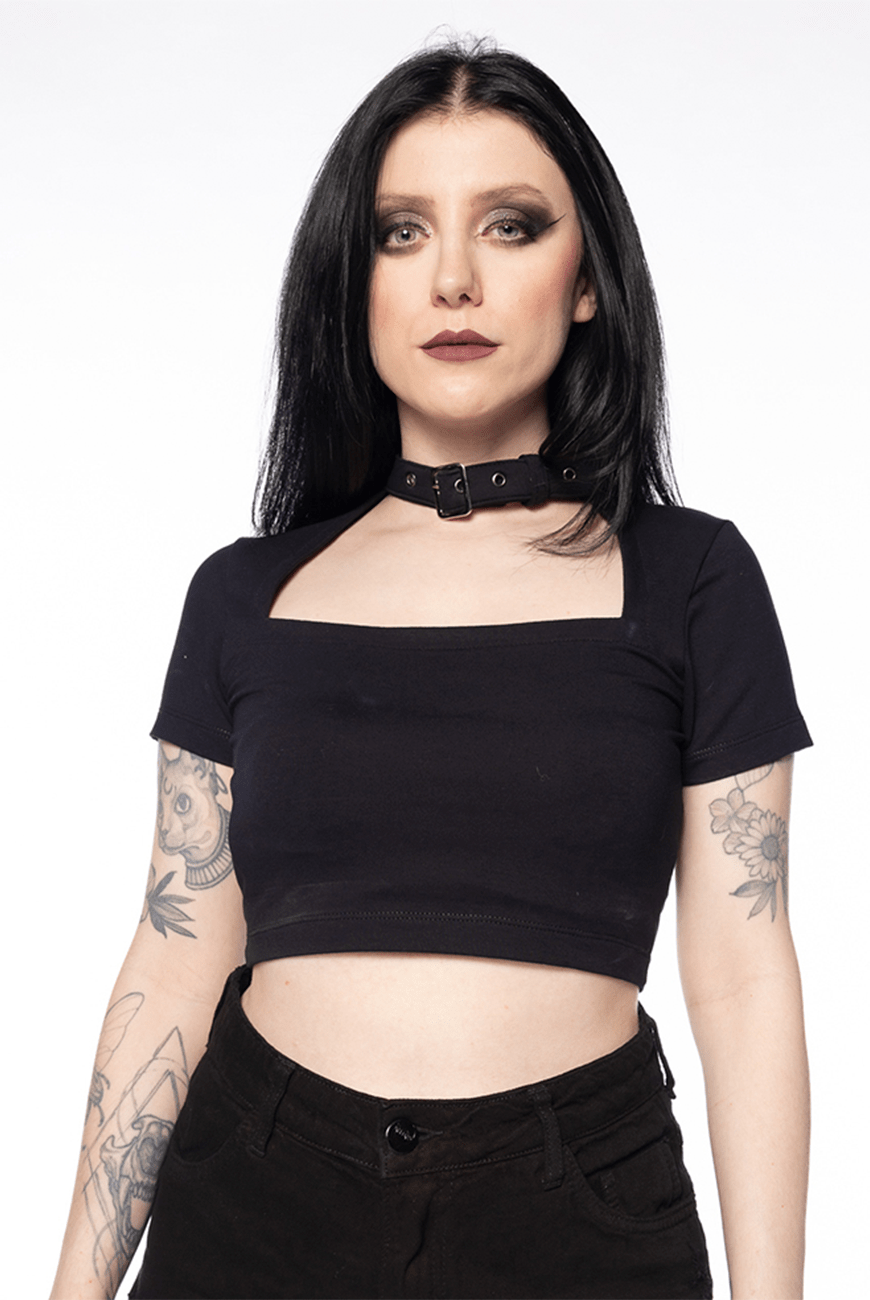 Cropped com abertura no decote que valoriza o corpo, é feito em malha confortável ao toque e possui detalhe de gola choker com ilhoses e fivela para regulagem. Modelo perfeito para as suas combinações trevosas e fofas do cotidiano, pois é uma peça que complementa qualquer look!