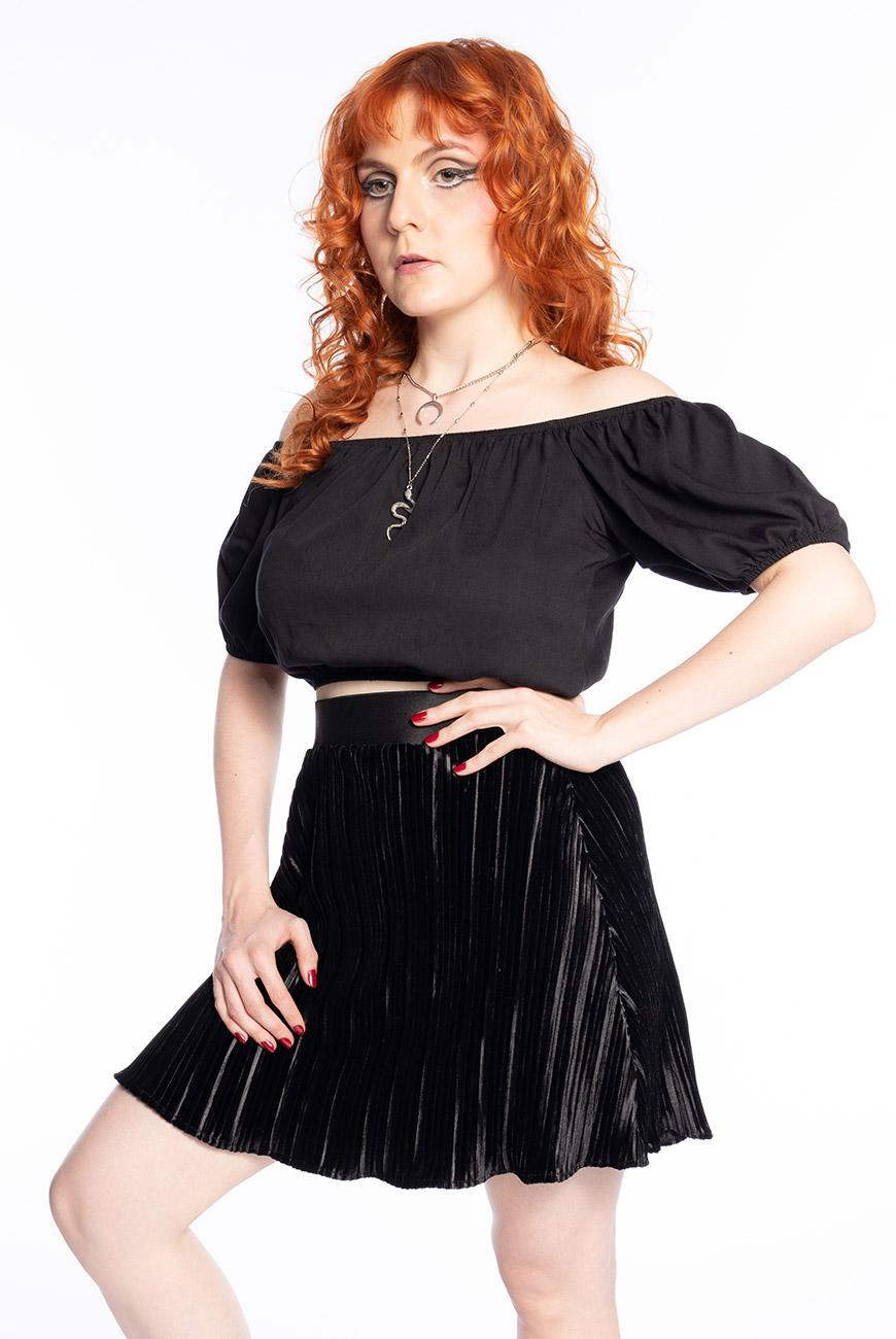 Cropped de modelagem ciganinha, feito em viscose na cor preta. Possui mangas que podem ser usadas no ombro ou abaixadas pra deixar os ombros de fora. Tem toque super confortável, é super leve para usar no calor e vai compor bem aquele seu look Vintage 70’s Witch. Fica perfeito com vários colares e aquela saia bem bruxiane.