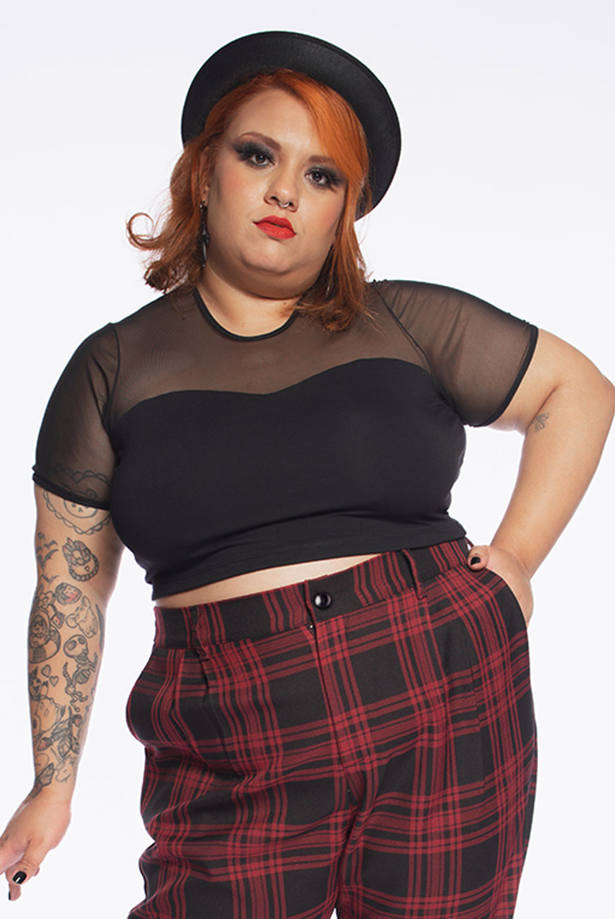 O cropped em moletinho encorpado, com janela de tule nos ombros e mangas, compõe muito bem qualquer look, podendo investir até em sobreposição para uma meia-estação.
