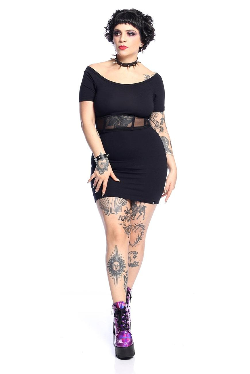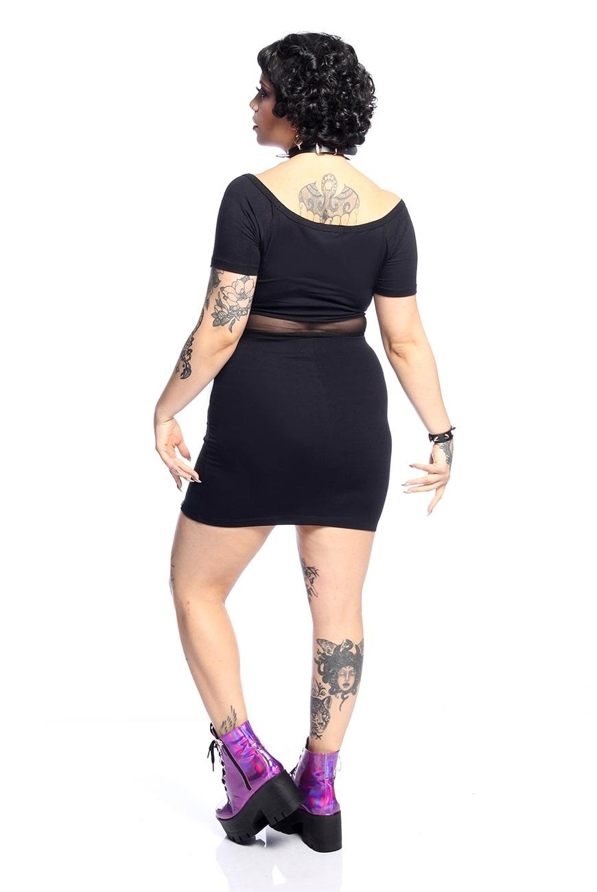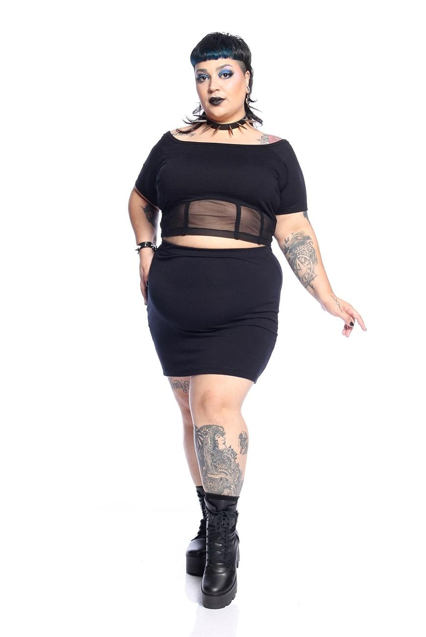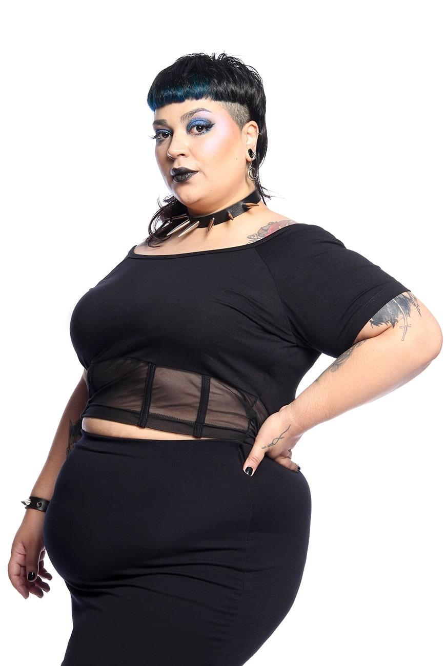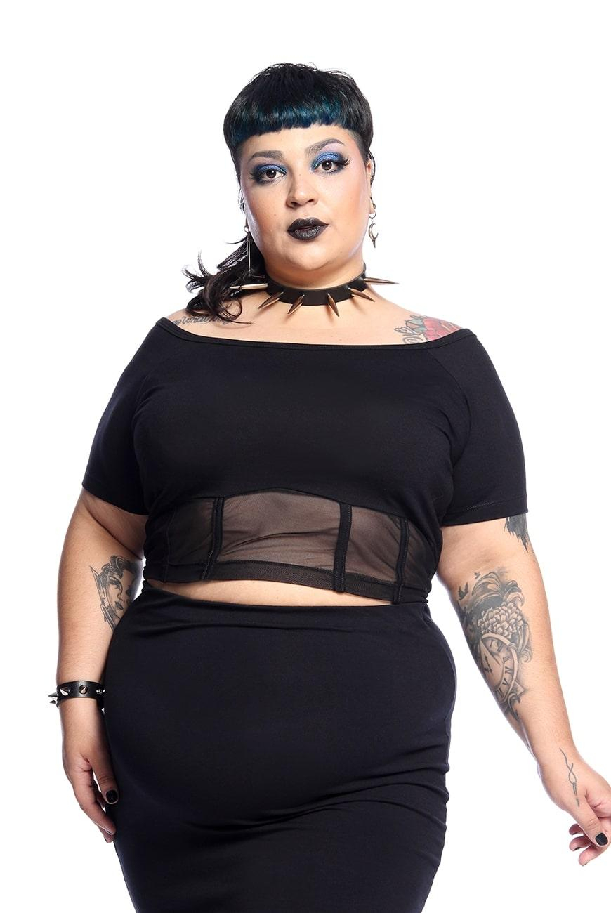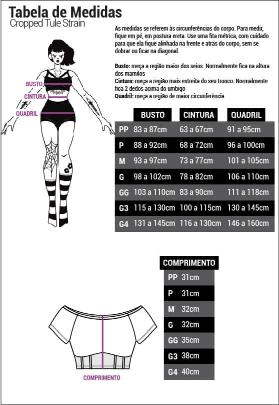 Cropped com decote ombro a ombro – super feminino, possui a parte abaixo do busto em tule com recortes que desenham bem a silhueta do corpo.