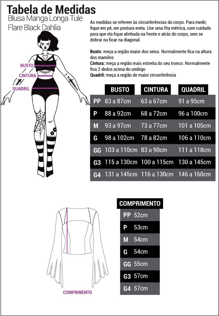 Modelo tamanho 3G: Altura: 1,60m/ Busto:115cm /Cintura: 96cm/ Quadril: 130cm.