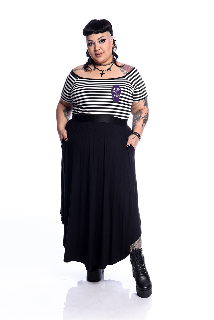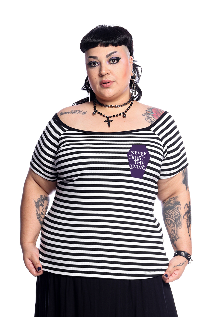 Além de ser preto e branca, tem a nossa estampa exclusiva de caixão na cor roxa com a frase Never Trust The Living, inspirada no grande clássico que todo alternativo ama: Beetlejuice!
