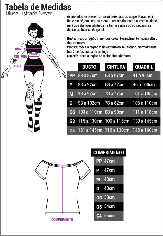 Modelo tamanho 3G: Altura: 1,60m/ Cintura: 101cm/ Busto: 121cm/ Quadril: 136cm.