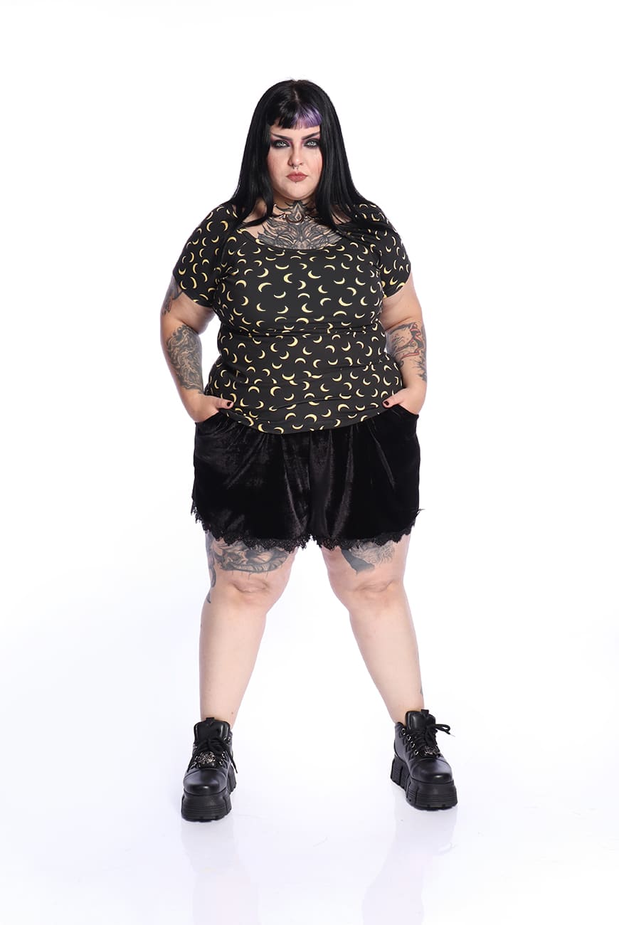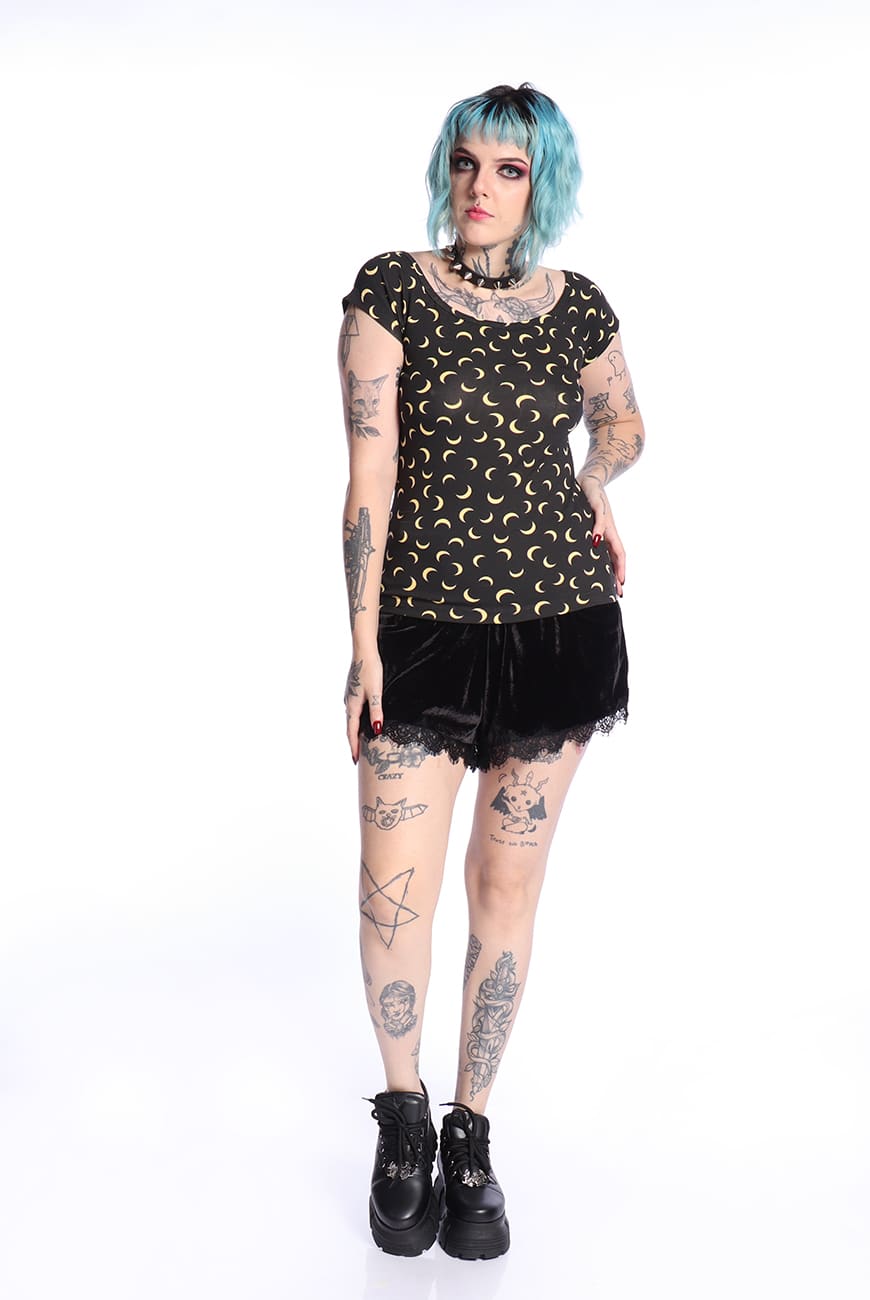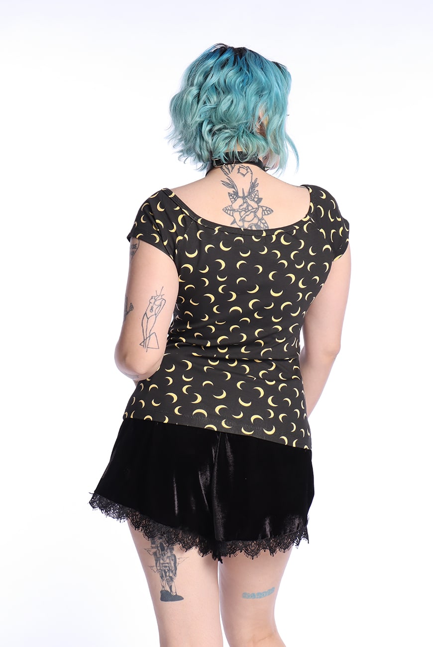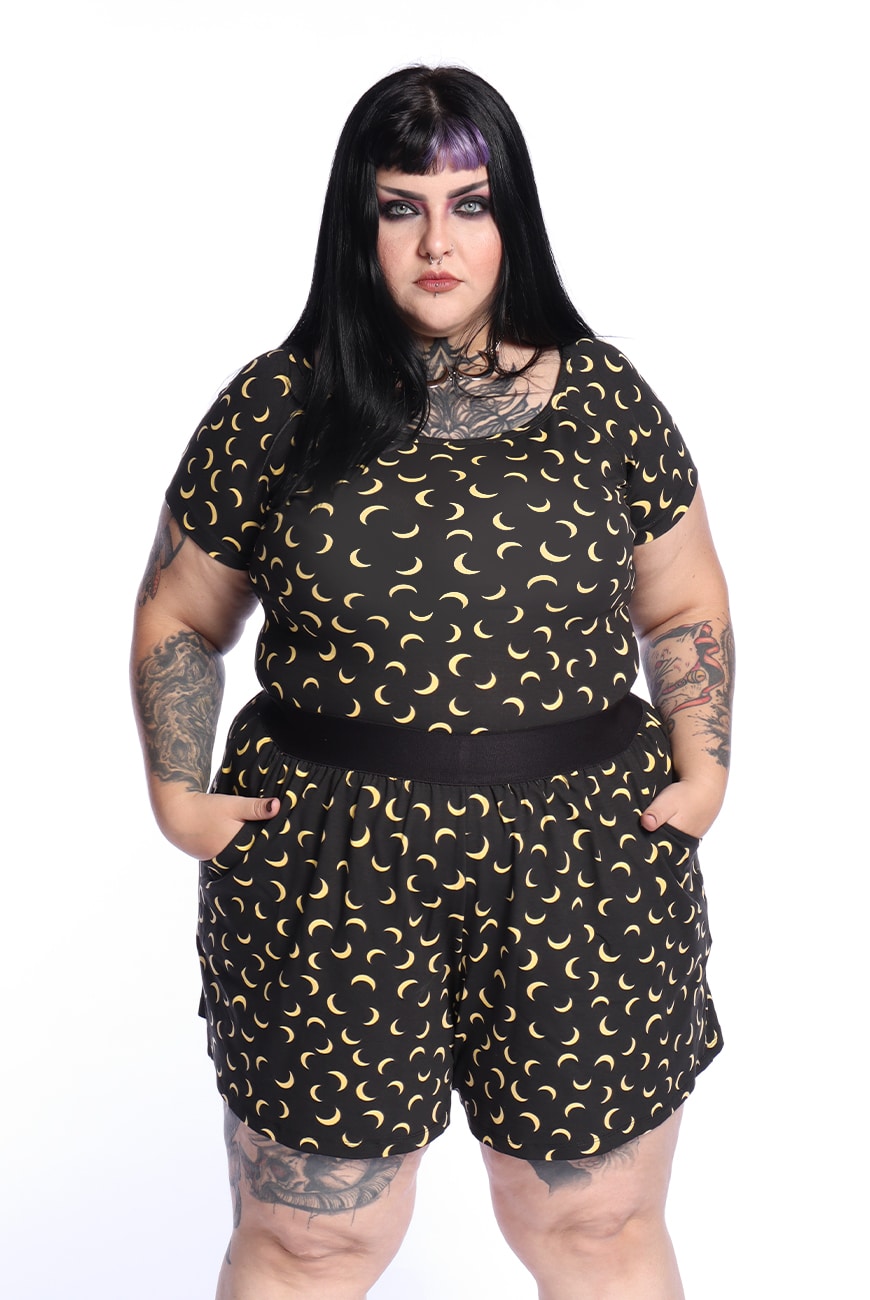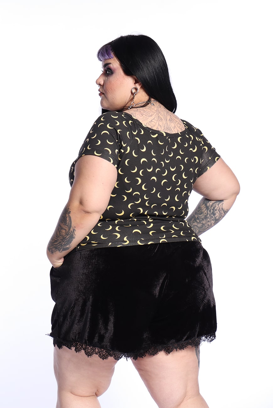 Possui uma estampa super fofinha com meias-luas amarelas no fundo preto, trazendo esse aspecto mais místico e casual e pode ser usada em qualquer ocasião!