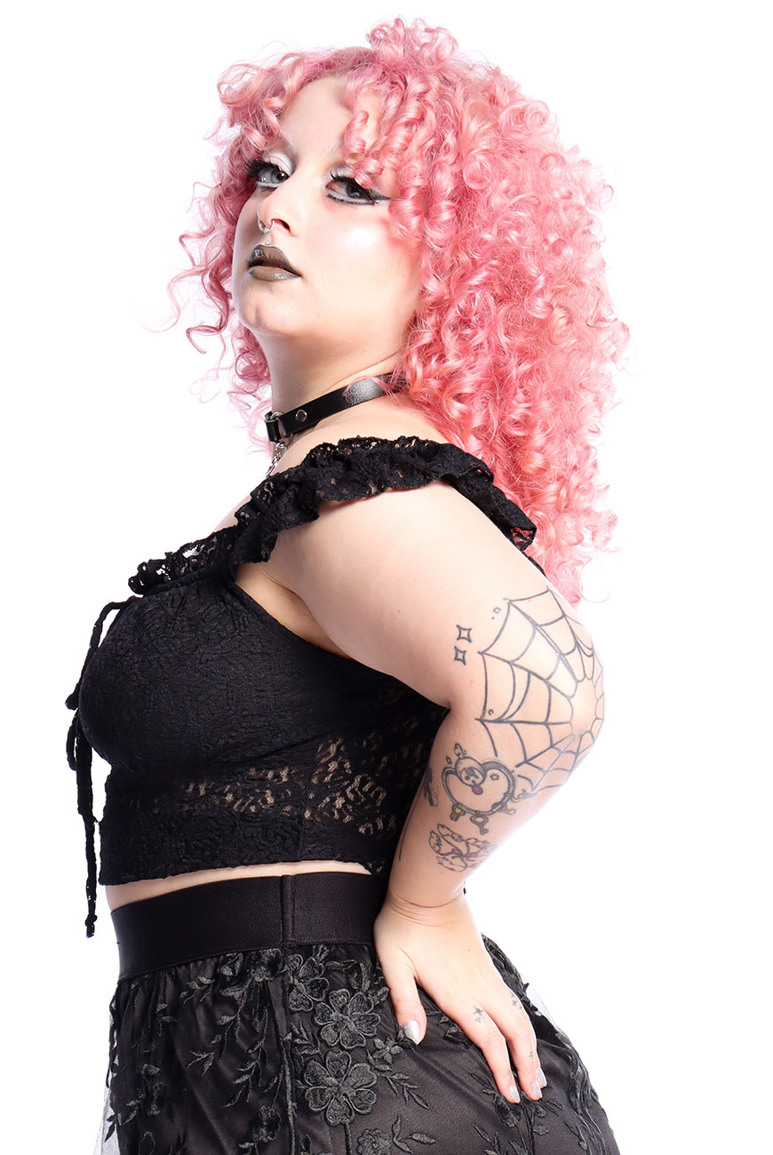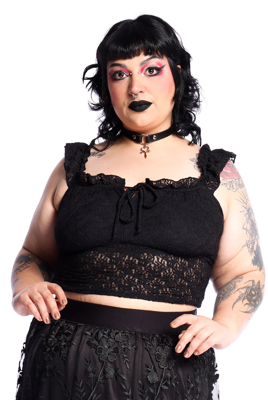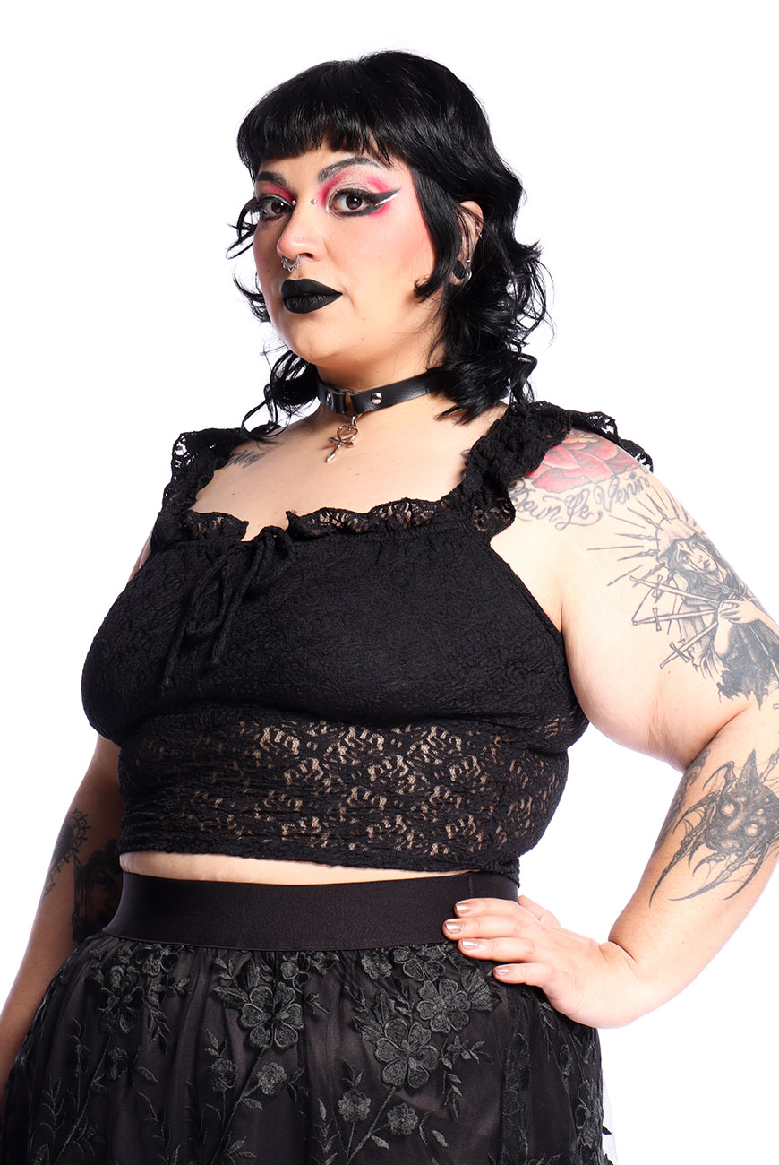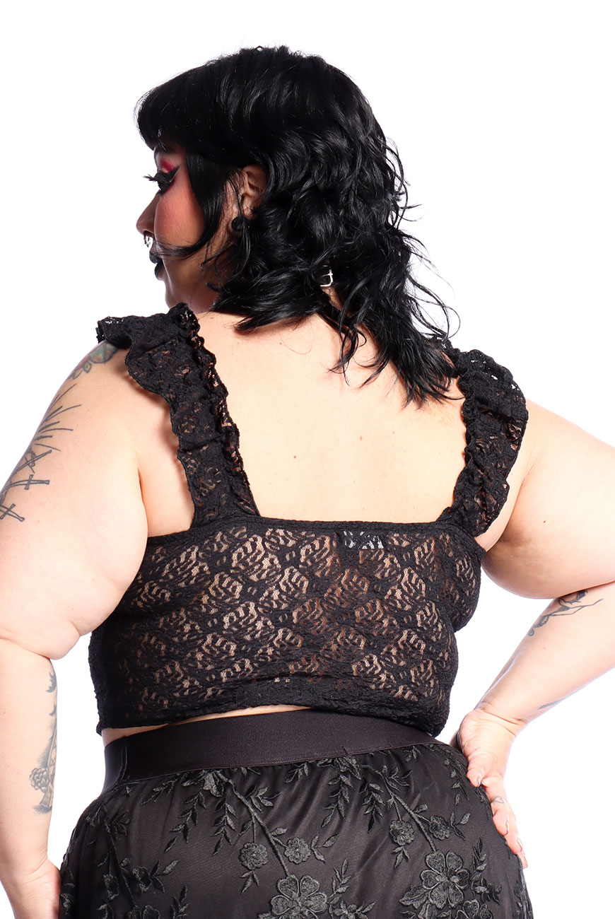 Produzida em renda preta com elastano e com toque super macio, é um modelo regata com comprimento mais curto, transparência na medida certa, recorte no busto e alças franzidas com renda também, trazendo esse ar mais romântico e dark para o modelo.