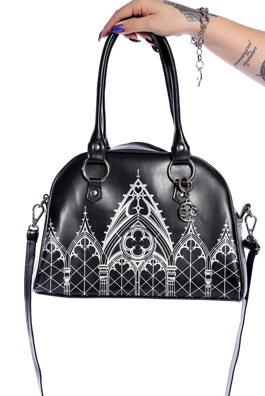 Produzida em material sintético de origem não animal, tem o tamanho ideal para levar tudo o que precisa durante o seu dia. Possui estampa exclusiva inspirada nas catedrais góticas na cor prata e acompanha chaveiro com o nosso pingente exclusivo de rosácea.