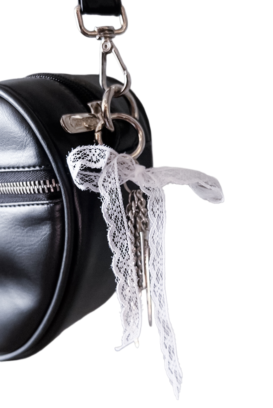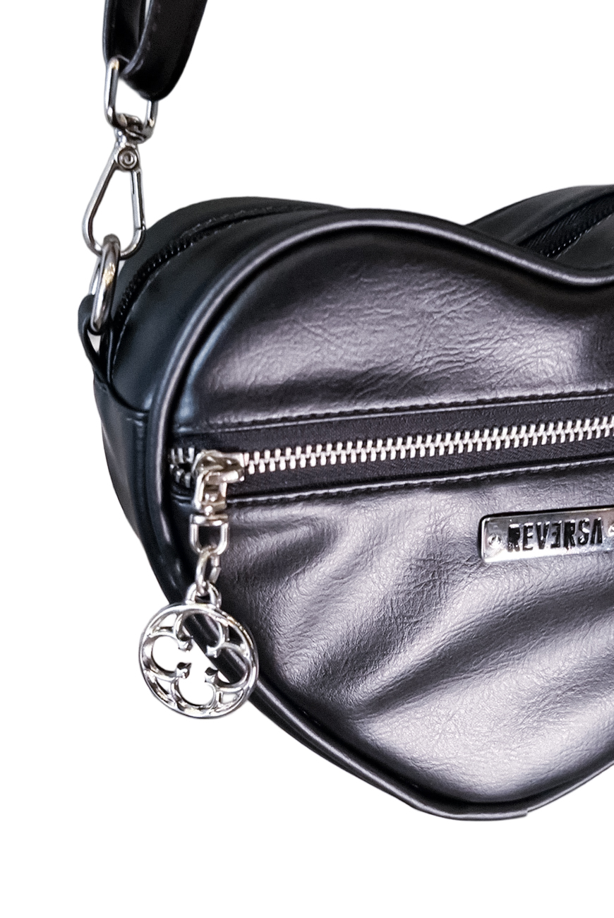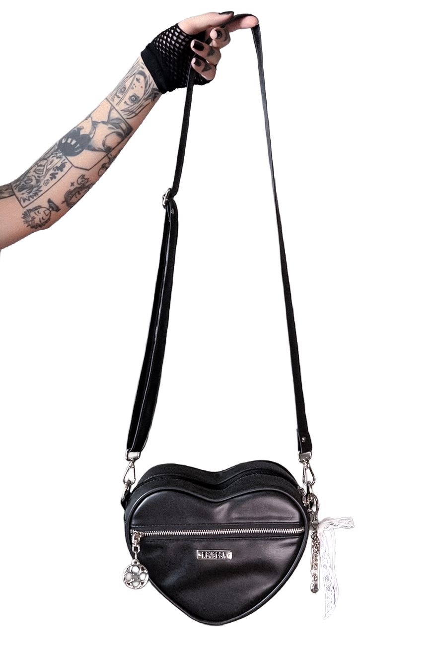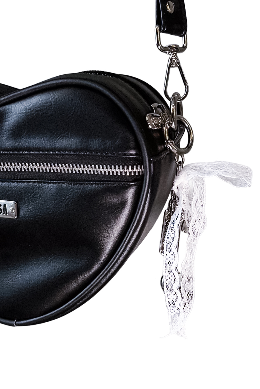 Produzida em material sintético de origem não animal na cor preta, foi desenvolvida no formato de coração, possui zíper de metal na frente com nosso puxador exclusivo de rosácea e chaveiro com charms e laço de renda branco, trazendo esse ar romântico que todas amamos.