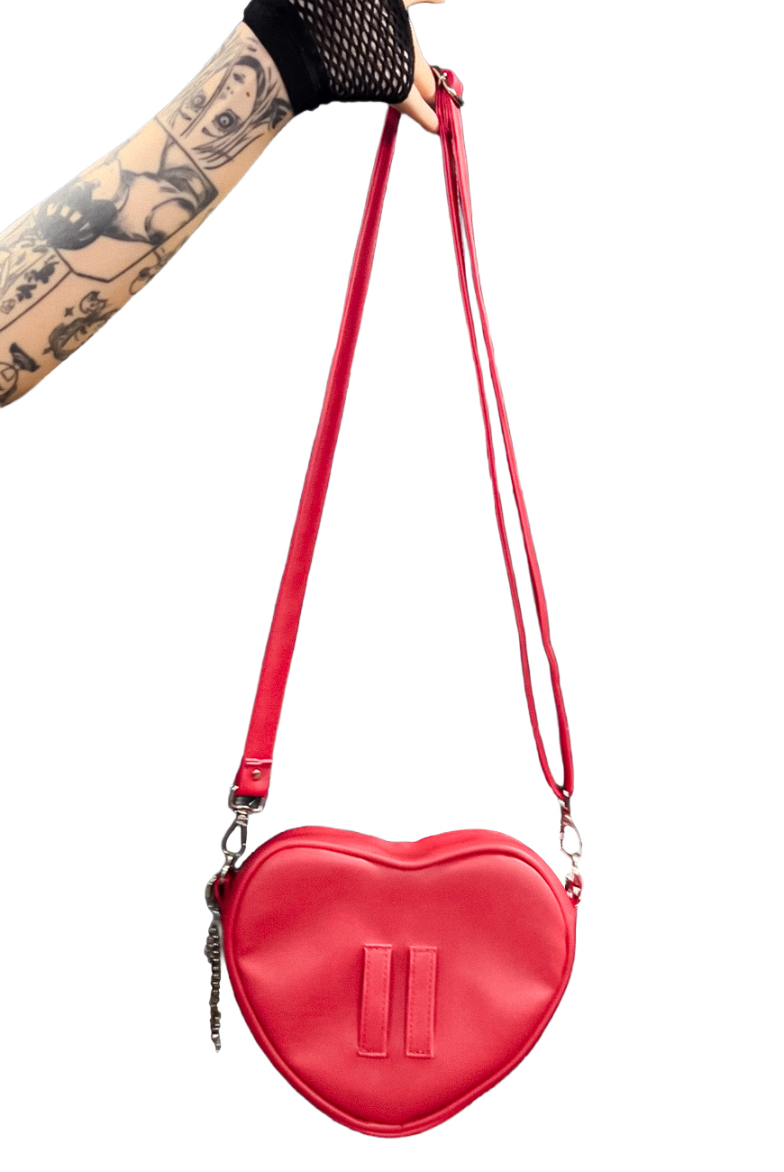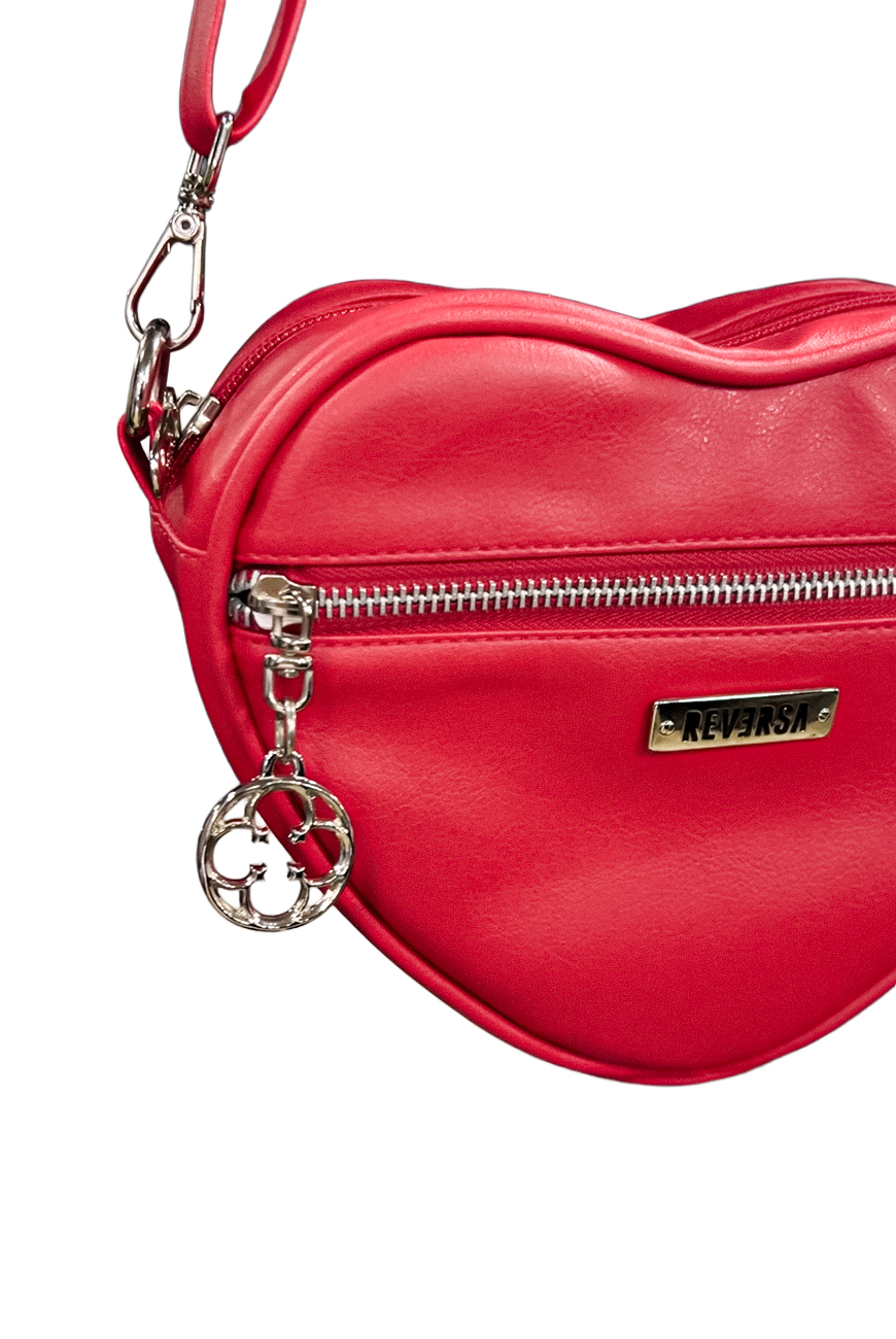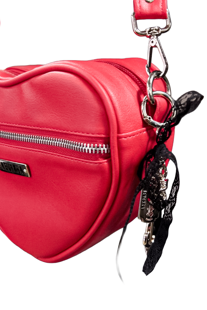 Produzida em material sintético de origem não animal na cor vermelha, foi desenvolvida no formato de coração, possui zíper de metal na frente com nosso puxador exclusivo de rosácea e chaveiro com charms e laço de renda preta, trazendo esse ar romântico que todas amamos.