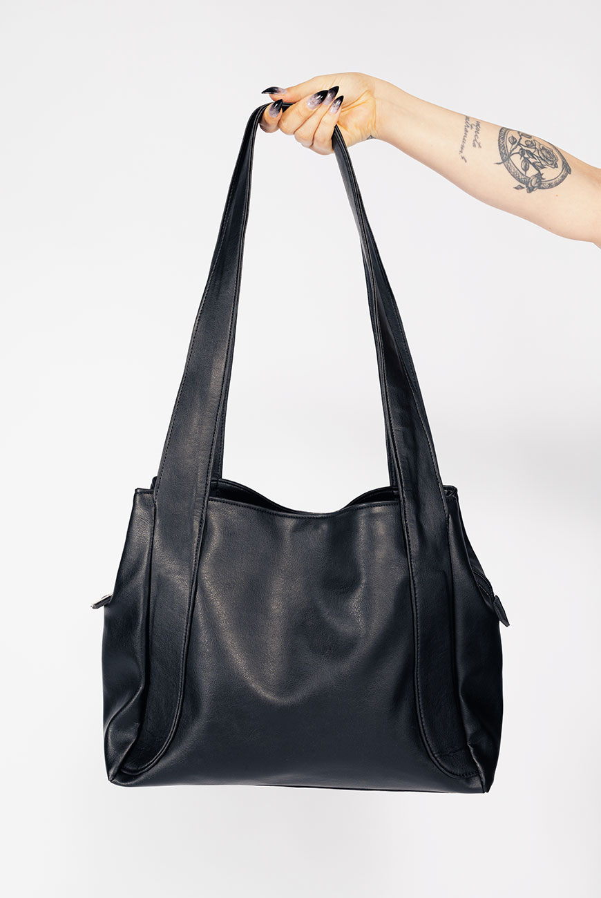 Bolsa produzida em material sintético de origem não animal, modelo espaçoso e ideal para carregar no ombro.