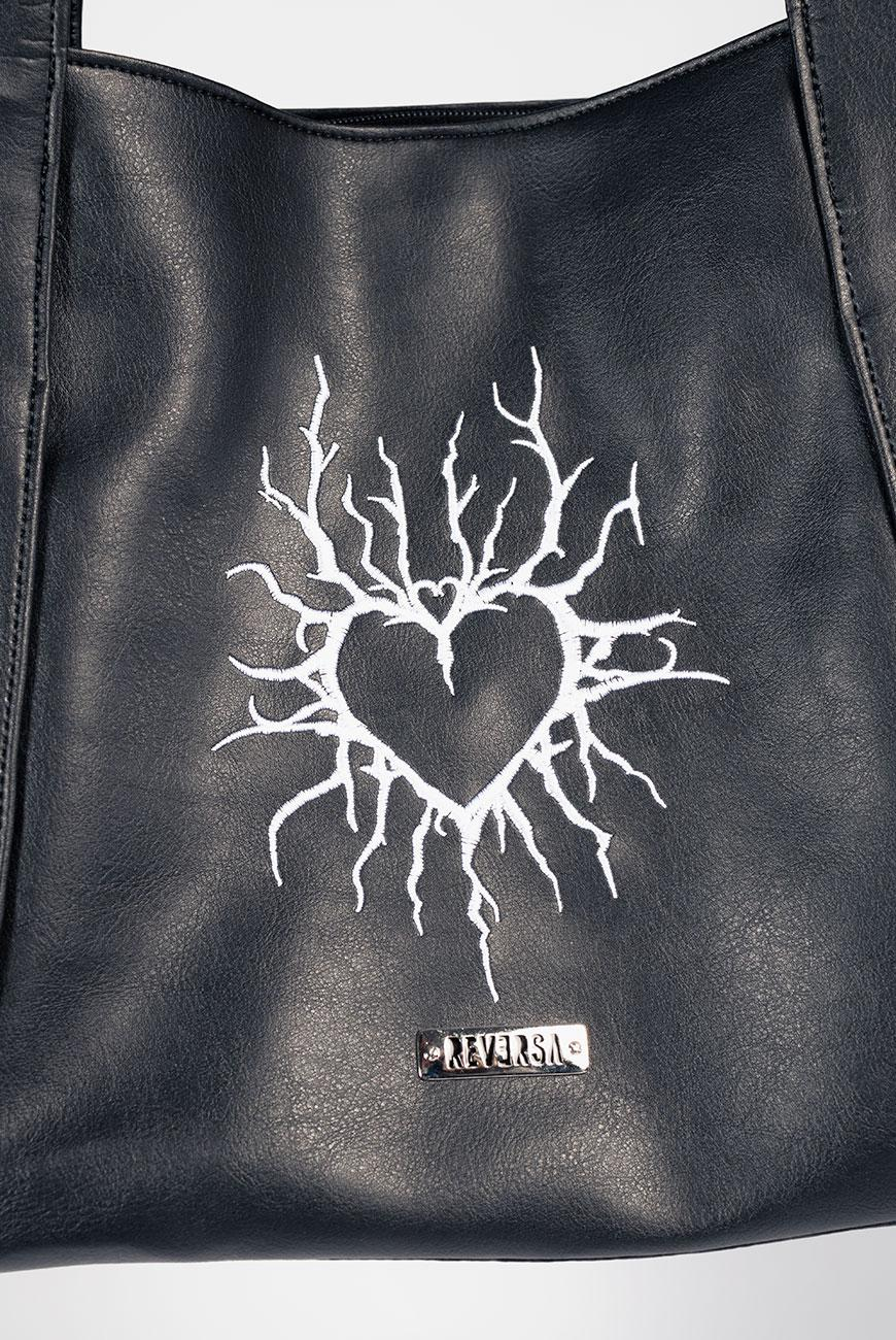 Napa preta com o bordado Coração Profano, de design exclusivo da Reversa.