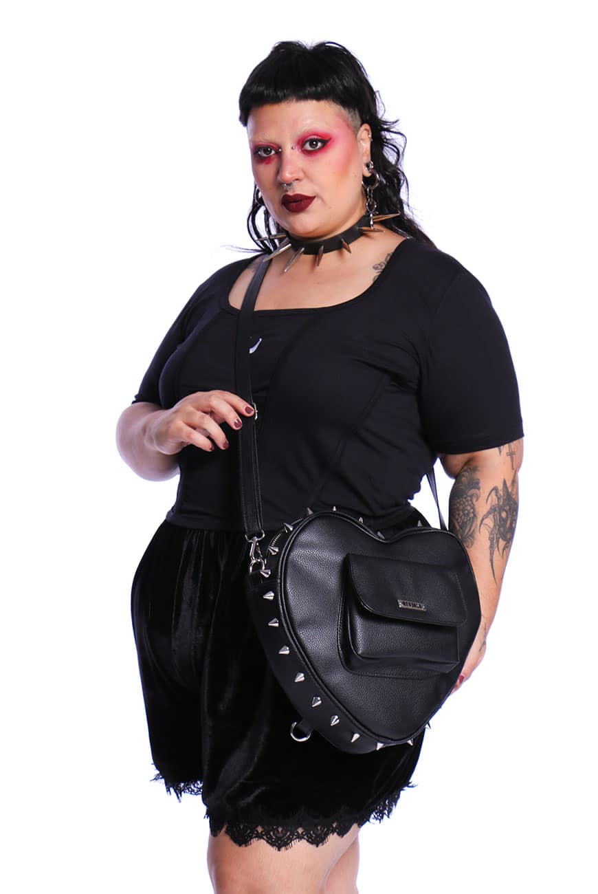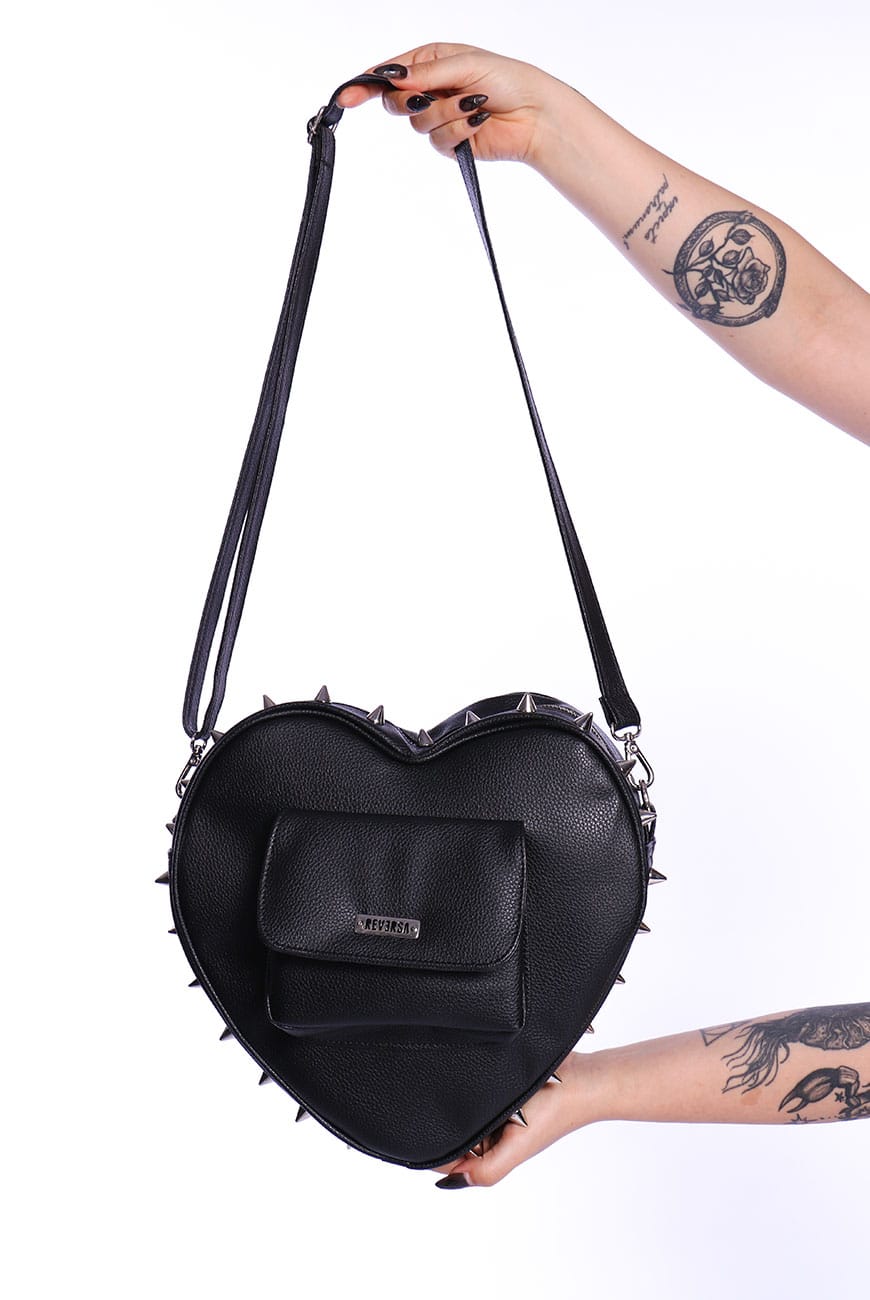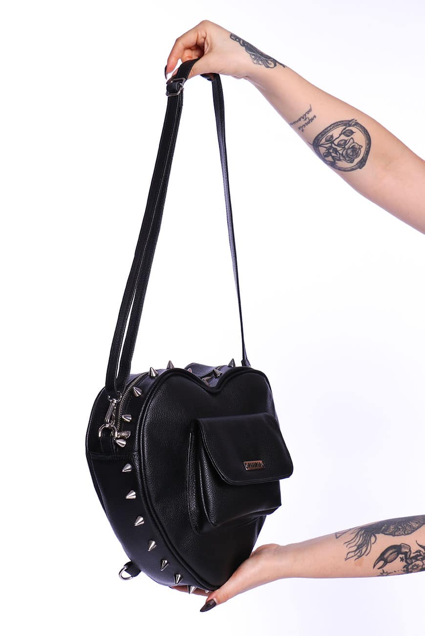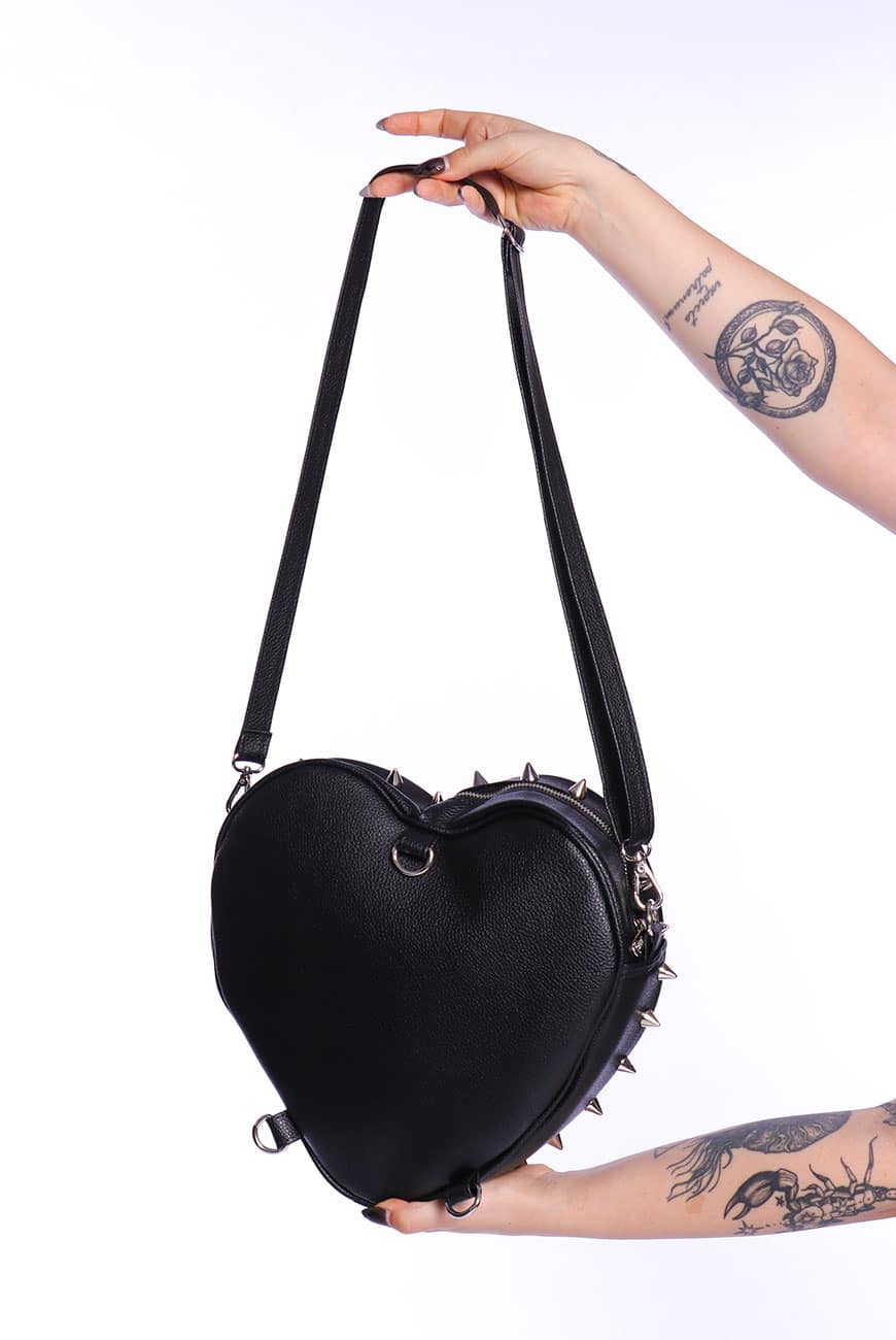 Produzida em napa sintética de origem não animal, foi desenvolvida no formato de coração e adornada com spikes niquelados por toda a sua circunferência, podendo ser usada como bolsa ou mochila.