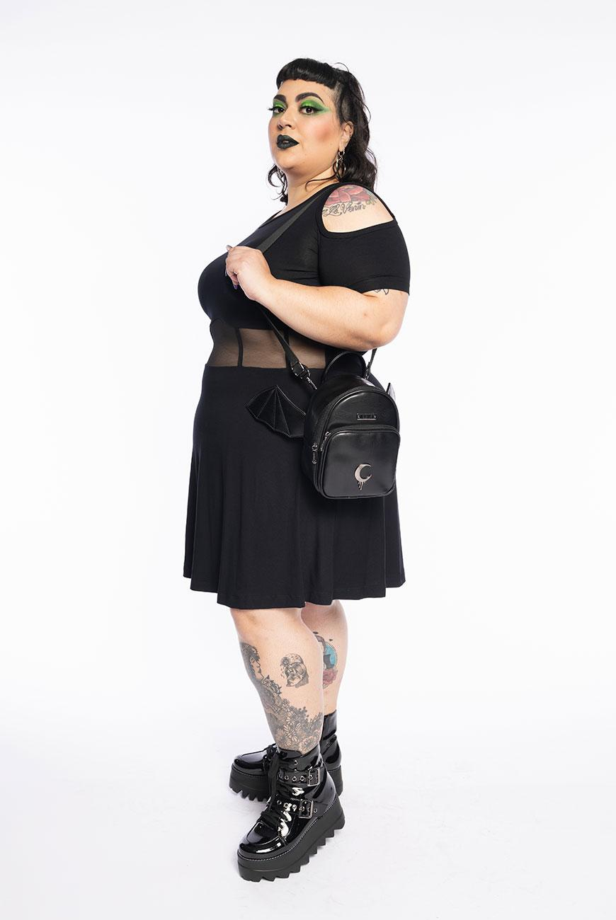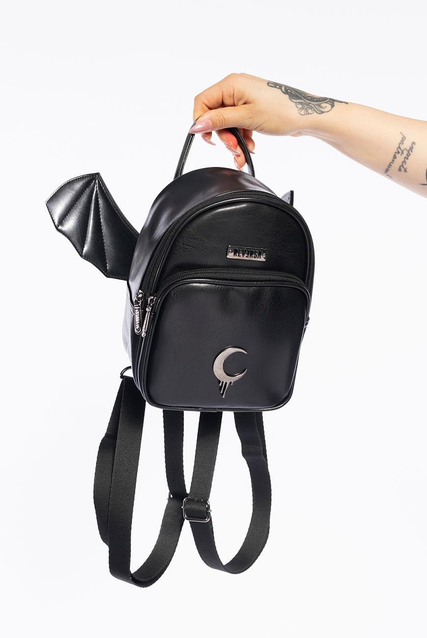 Versátil, com design diferenciado, vem trazer um toque despojado ao look. Mochila pequena produzida em material sintético de origem não animal e adorno exclusivo da lua da Reversa. Possui bolso frontal e compartimento principal com fechamento em zíper, alças de mochila reguláveis e removíveis e alça de mão na parte superior. Pode ser usada como bolsa transversal. Na parte posterior possui asinhas de morcego fixas com 15cm cada, confeccionadas no mesmo material do corpo da mochila. O forro é roxo e possui bolso interno simples.