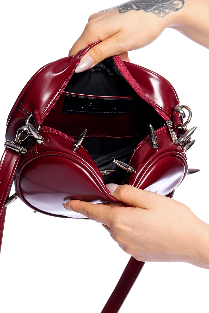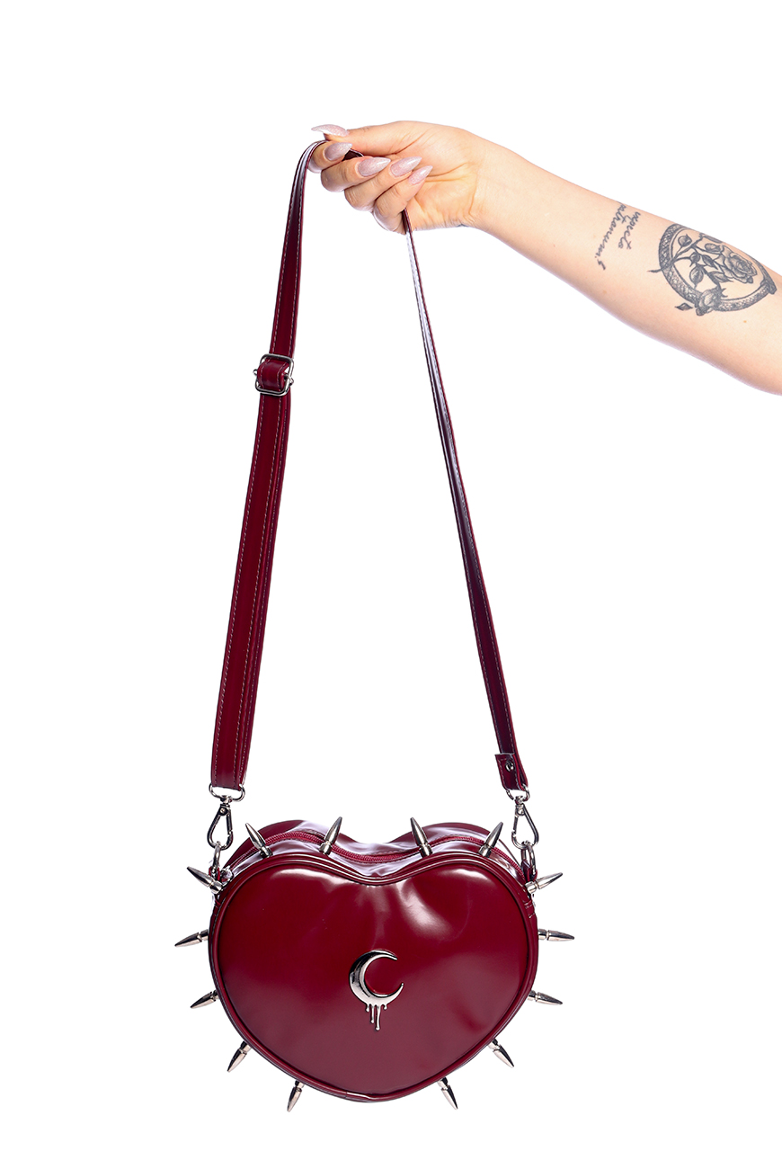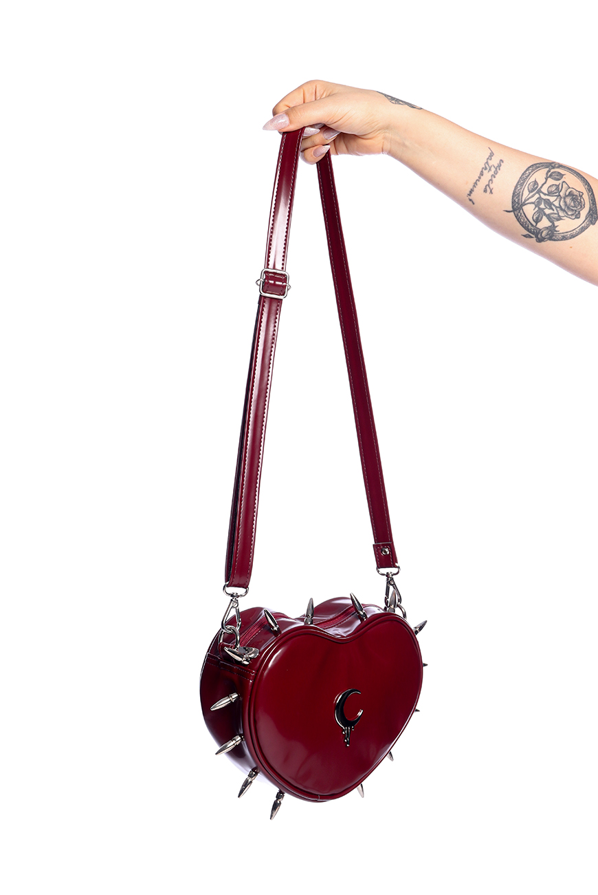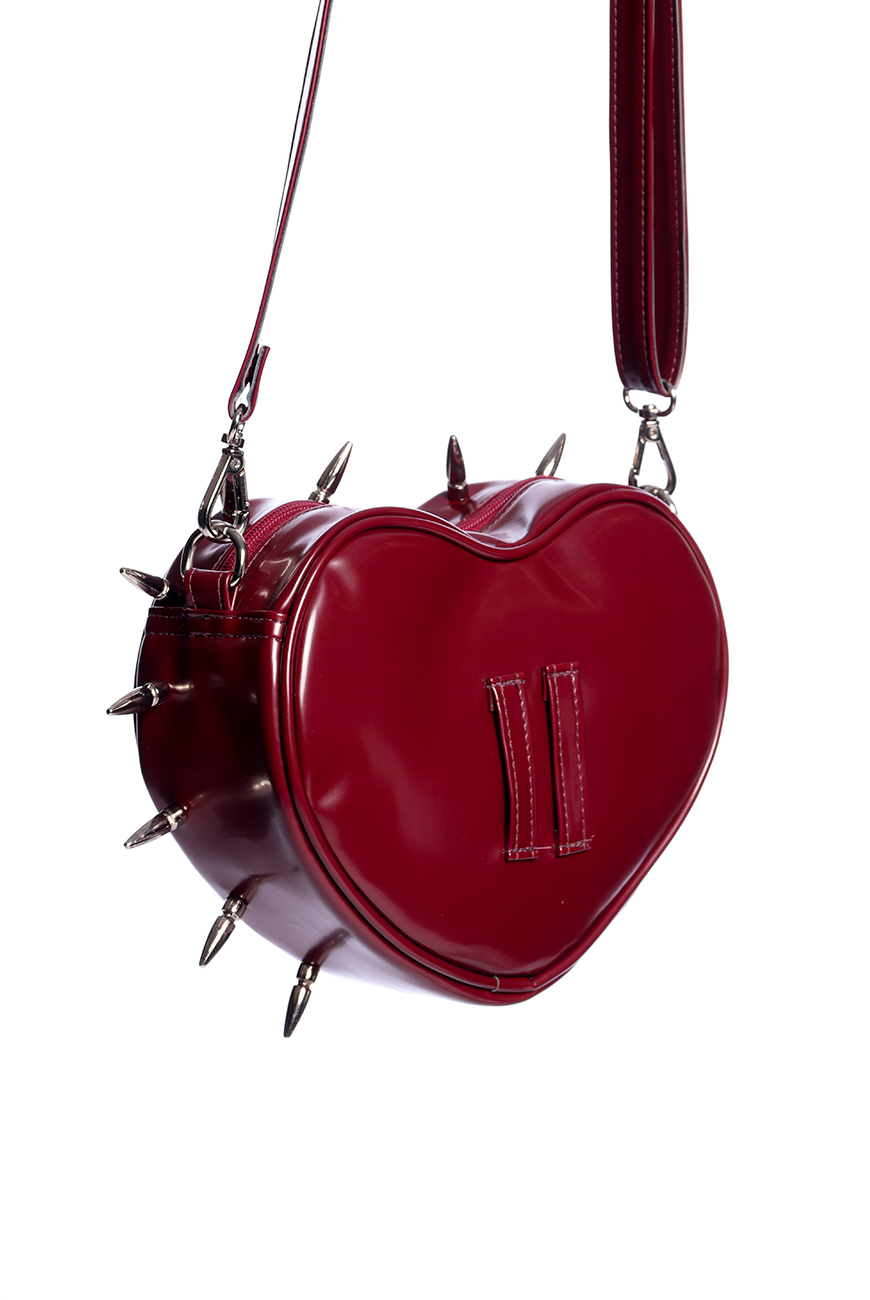 Produzida em material sintético de origem não animal na cor bordô, foi desenvolvida no formato de coração e tem spikes niquelados por toda a sua circunferência.