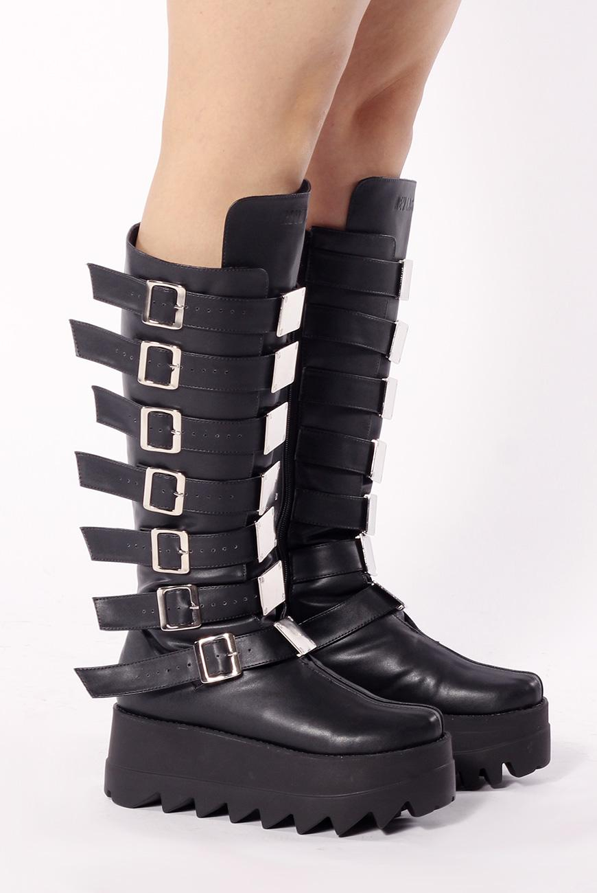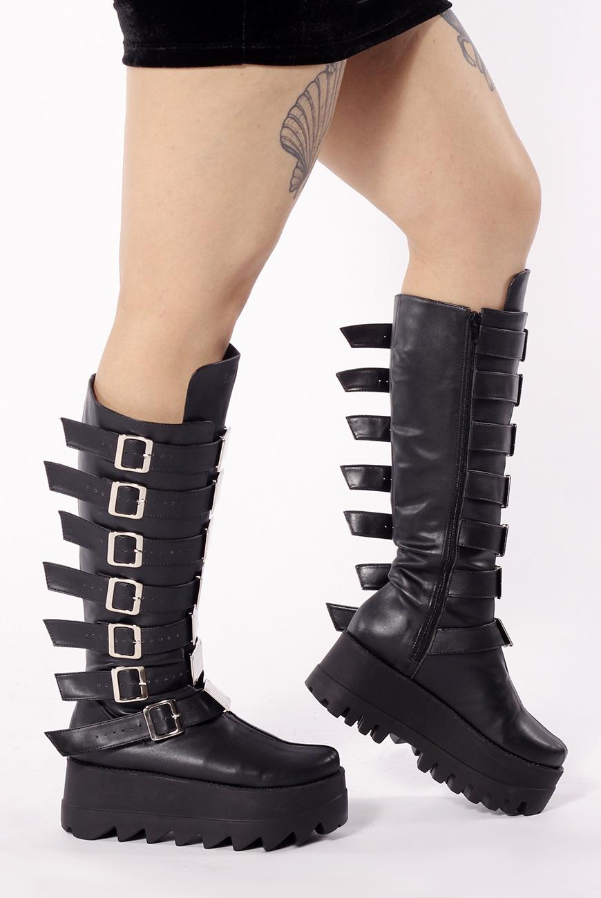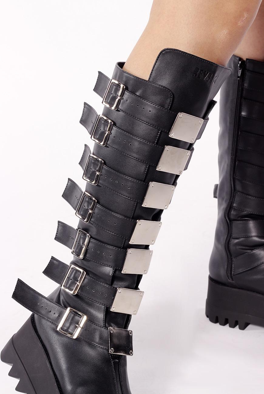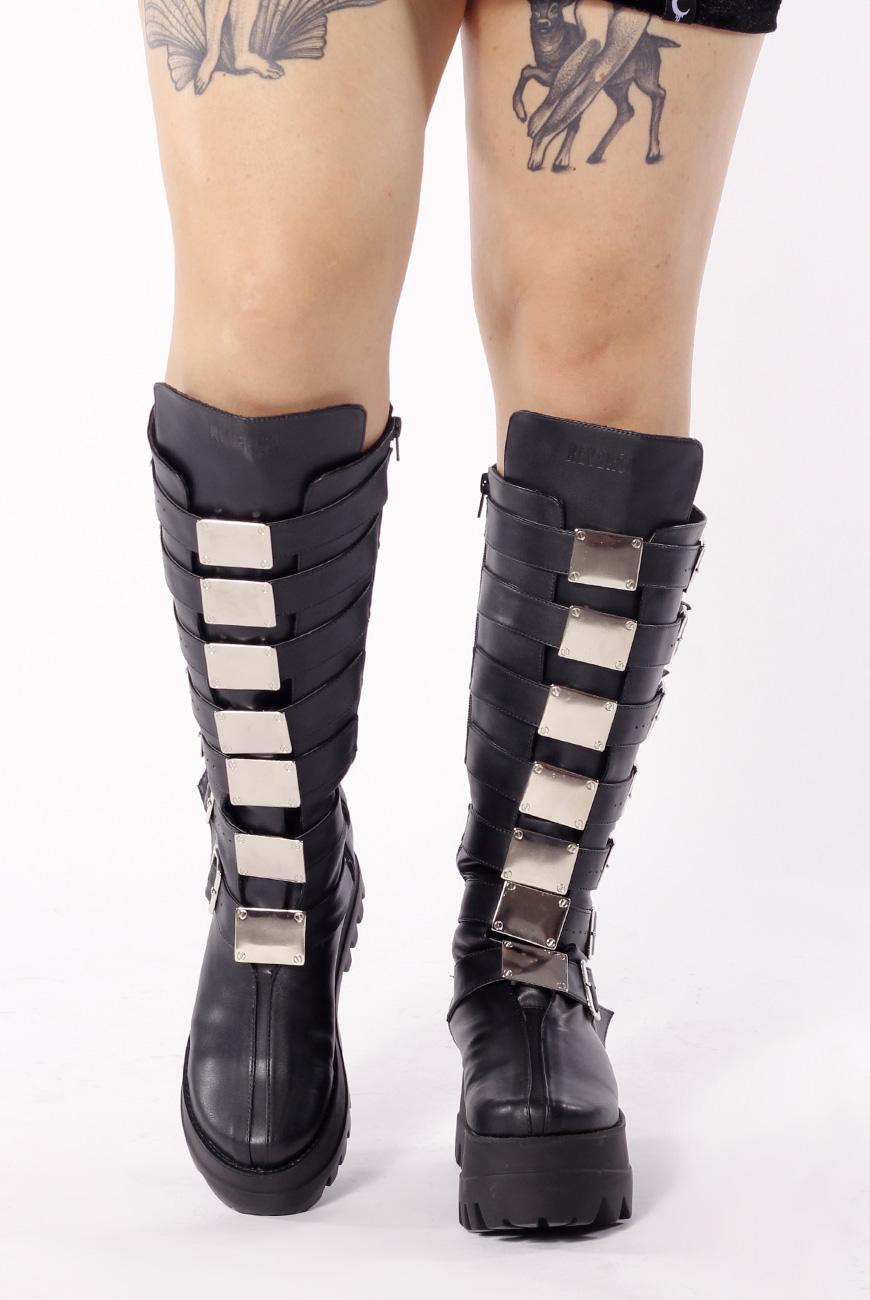 Inspirada em uma das mais famosas obras cyberpunk, a Neuromancer veio para fazer você se apaixonar! Bota de cano alto em material alternativo de origem não animal, com solado tratorado e detalhes especiais de tiras com fivelas reguladoras nas laterais e placas centralizadas em todo o cabedal. As placas são passadores presos às tiras, que podem ser alinhados conforme você preferir.