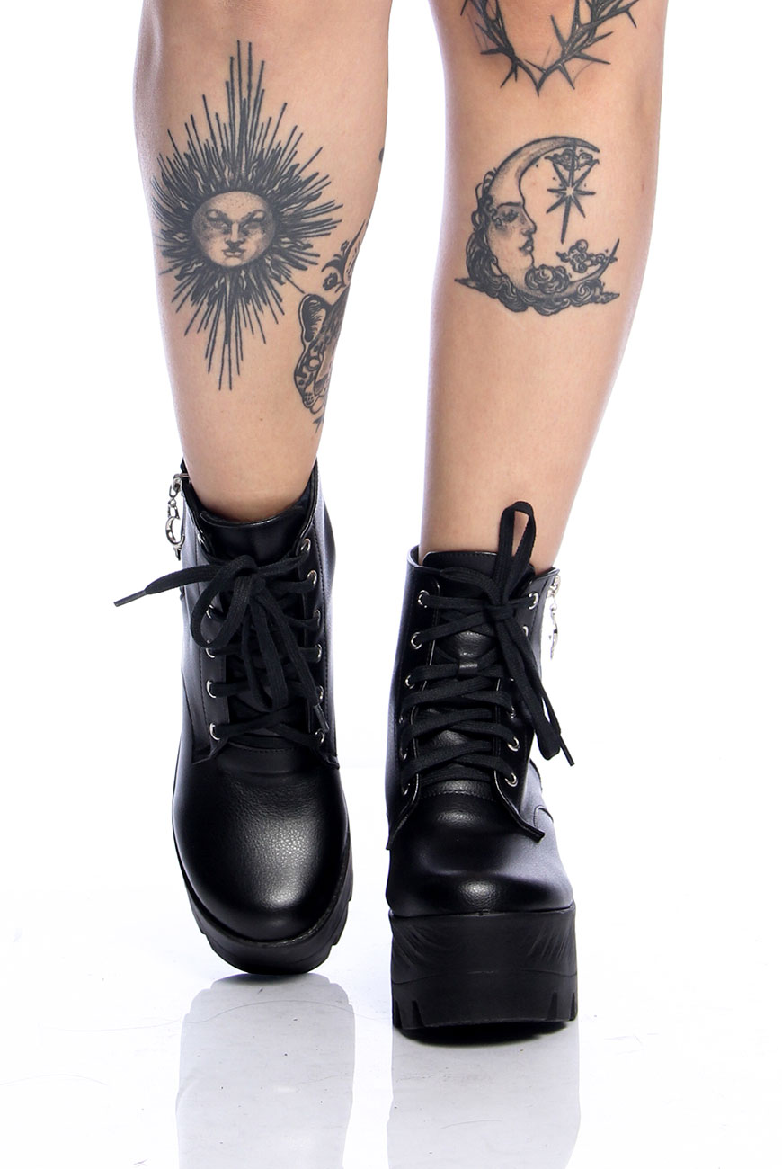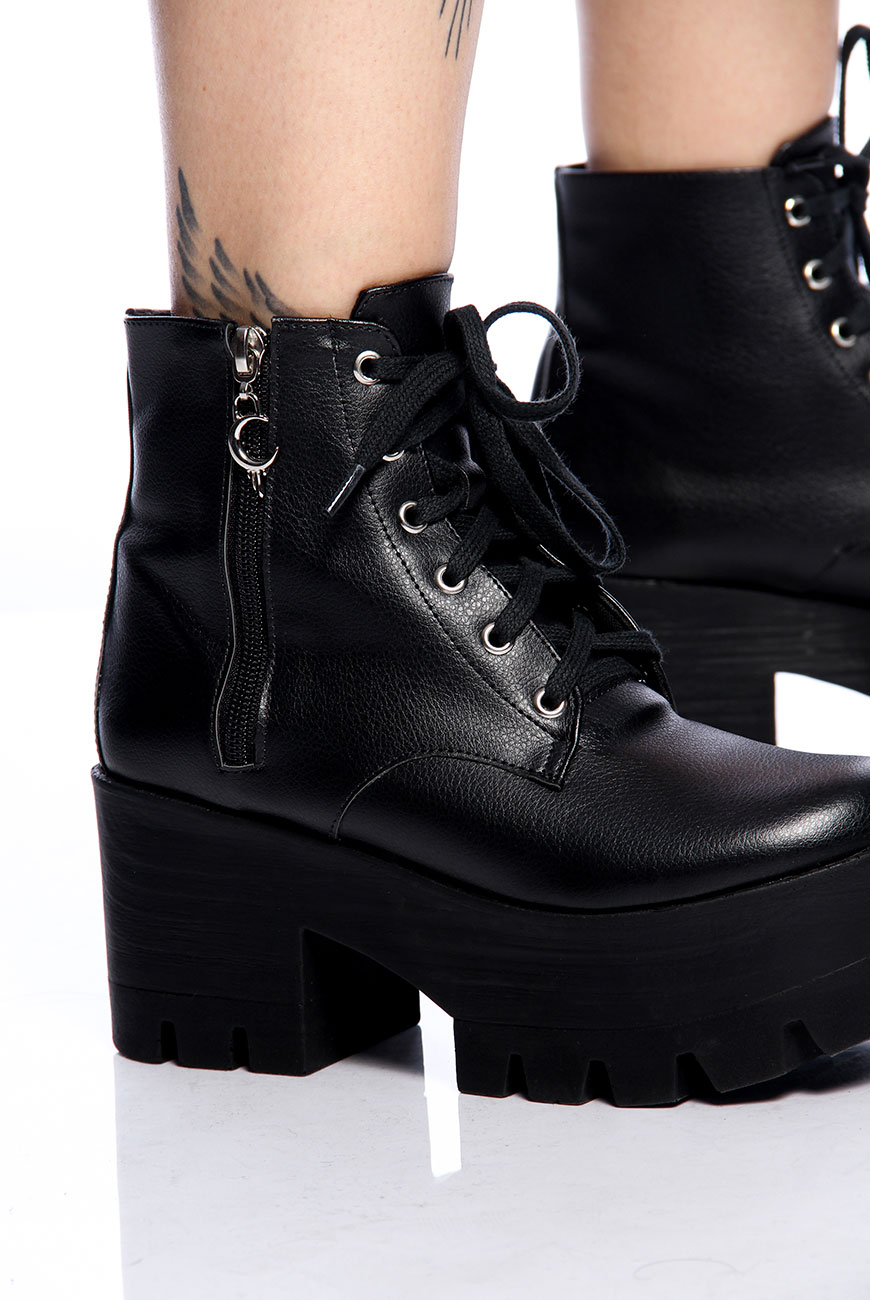 Coturno em material sintético de origem não animal e super plataforma de solado tratorado, com ilhoses niquelados e cadarços para melhor ajuste. Para facilitar o calce, tem zíper na lateral externa com nosso puxador exclusivo de Lua Reversa.