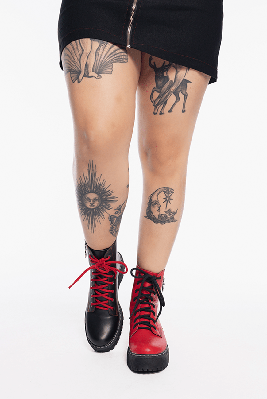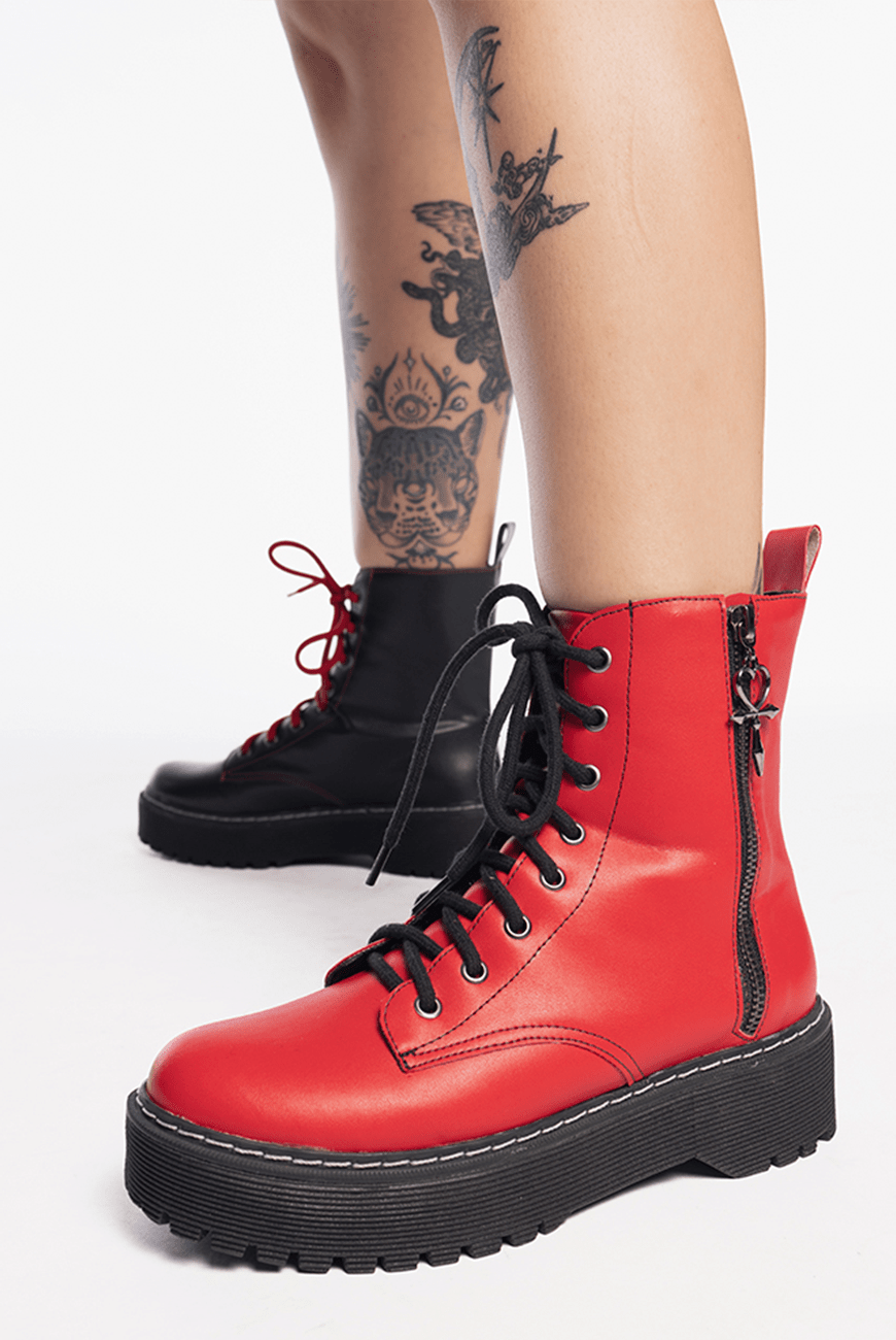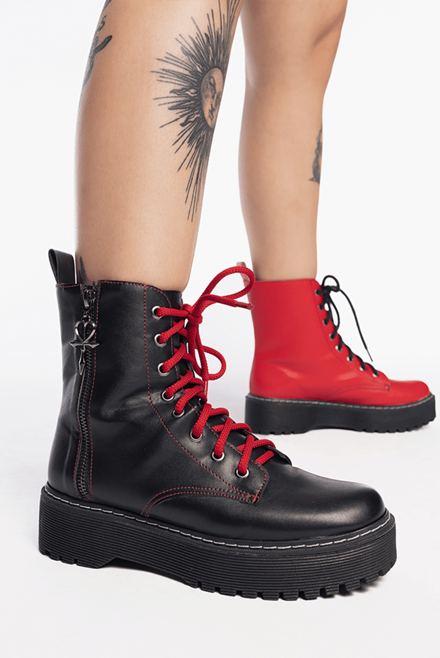 Nosso Coturno Bite é um modelo único e super exclusivo com um pé de cada cor: um lado possui cabedal na cor vermelha com detalhes pretos, e o outro lado é preto com detalhes vermelhos. Ambos tem zíper para calçar e puxador exclusivo Vampire Heart.