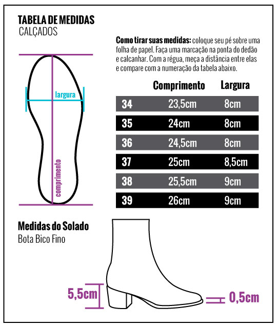 Altura do solado: possui salto de 5,5cm e frente de 0,5cm.