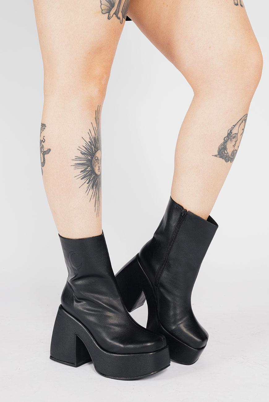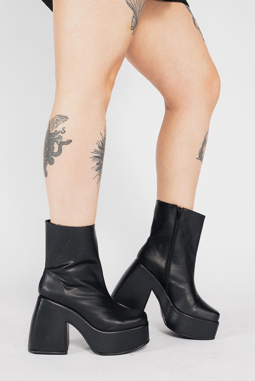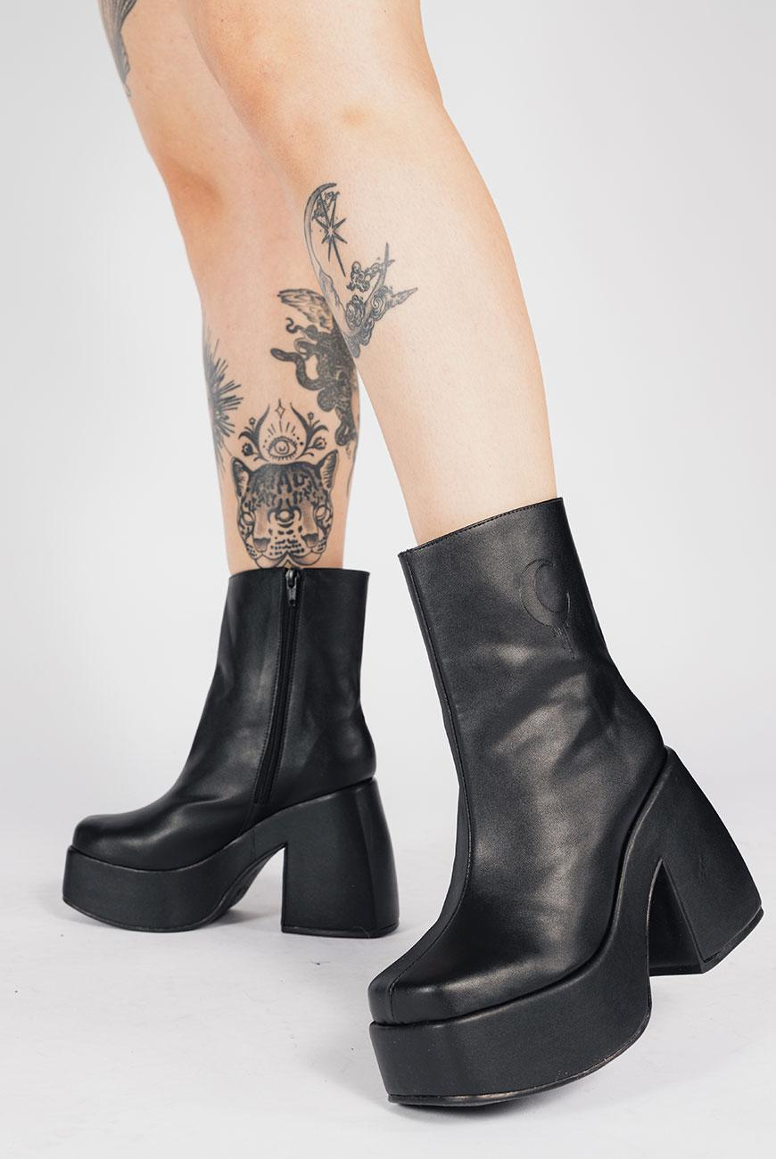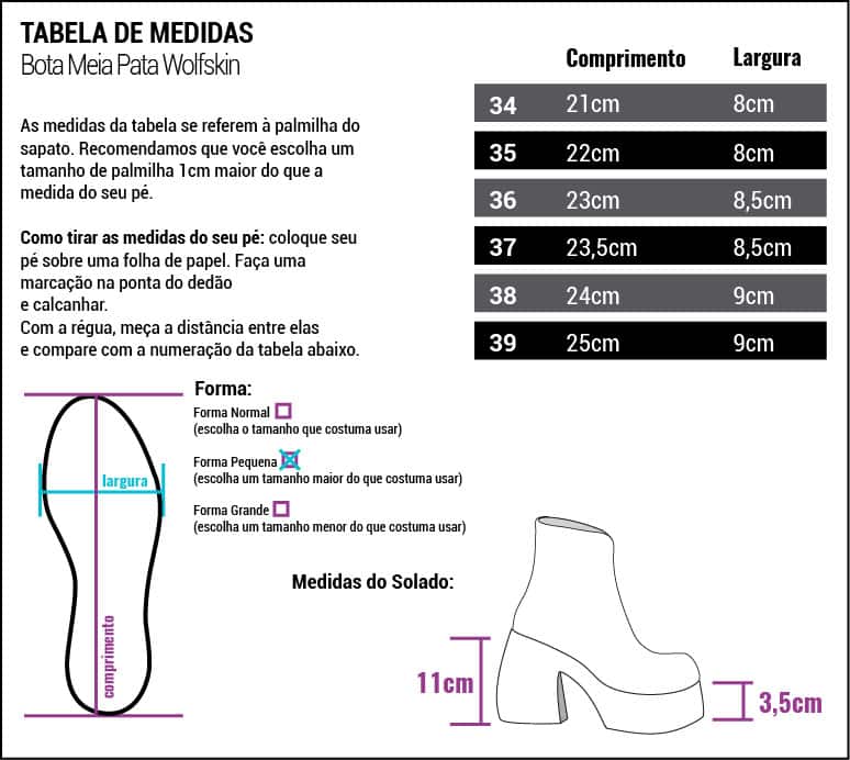 A Bota Meia Pata Wolfskin é produzida em um material super macio e confortável, com salto grosso e plataforma na frente para mais estabilidade, além do detalhe lindíssimo da nossa Lua Reversa na lateral externa. Possui fechamento por zíper na lateral interna, facilitando o calce.