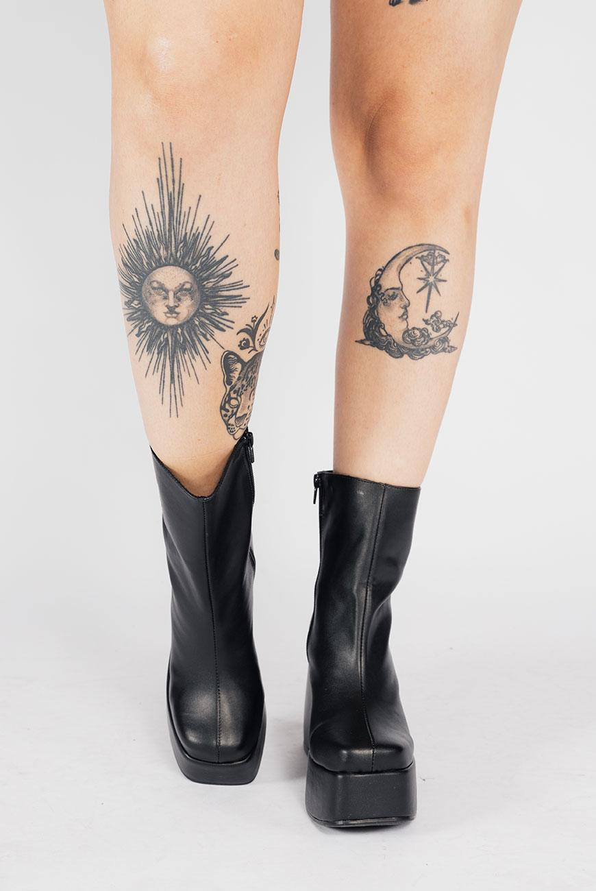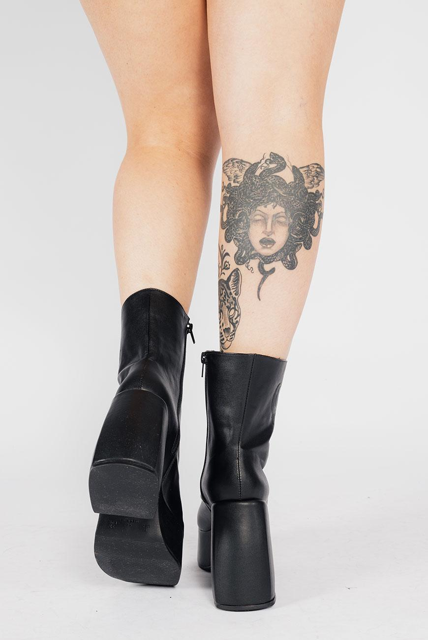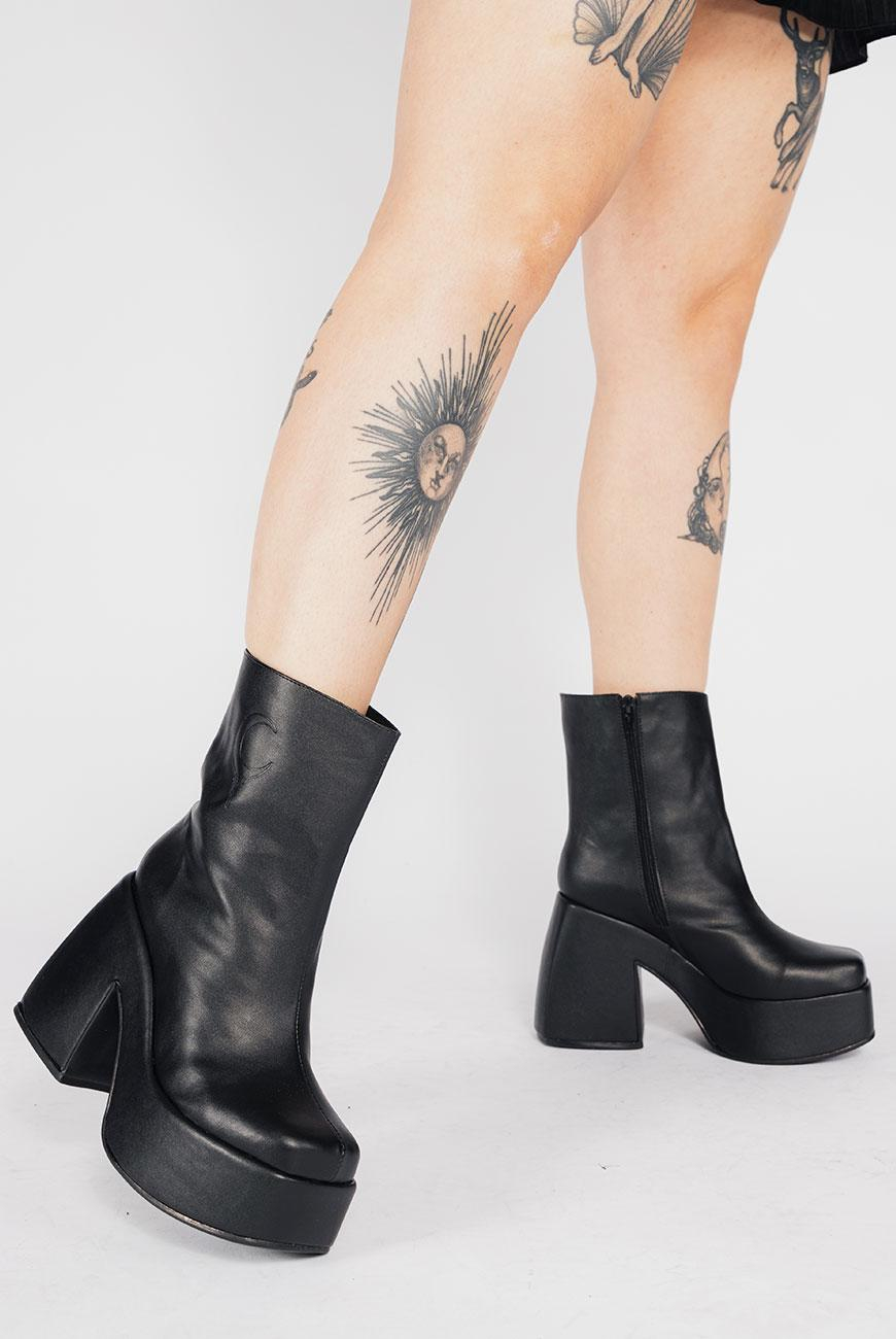 A Bota Meia Pata Wolfskin é produzida em um material super macio e confortável, com salto grosso e plataforma na frente para mais estabilidade, além do detalhe lindíssimo da nossa Lua Reversa na lateral externa. Possui fechamento por zíper na lateral interna, facilitando o calce.