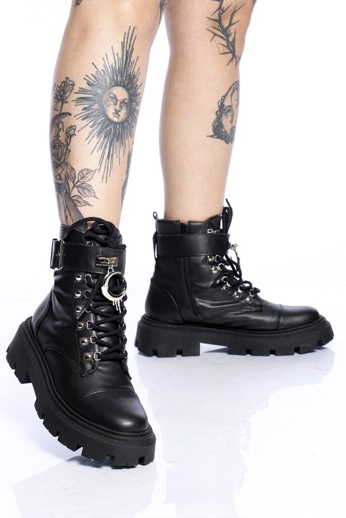 Com o cano super alto, acima dos joelhos, tem ilhoses niquelados e cadarço na parte frontal para melhor regulagem, além do zíper na lateral interna para facilitar o calce.