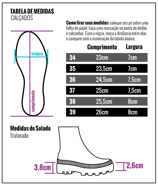 Altura do solado: possui 2,6cm de frente e salto de 3,8cm na parte traseira.