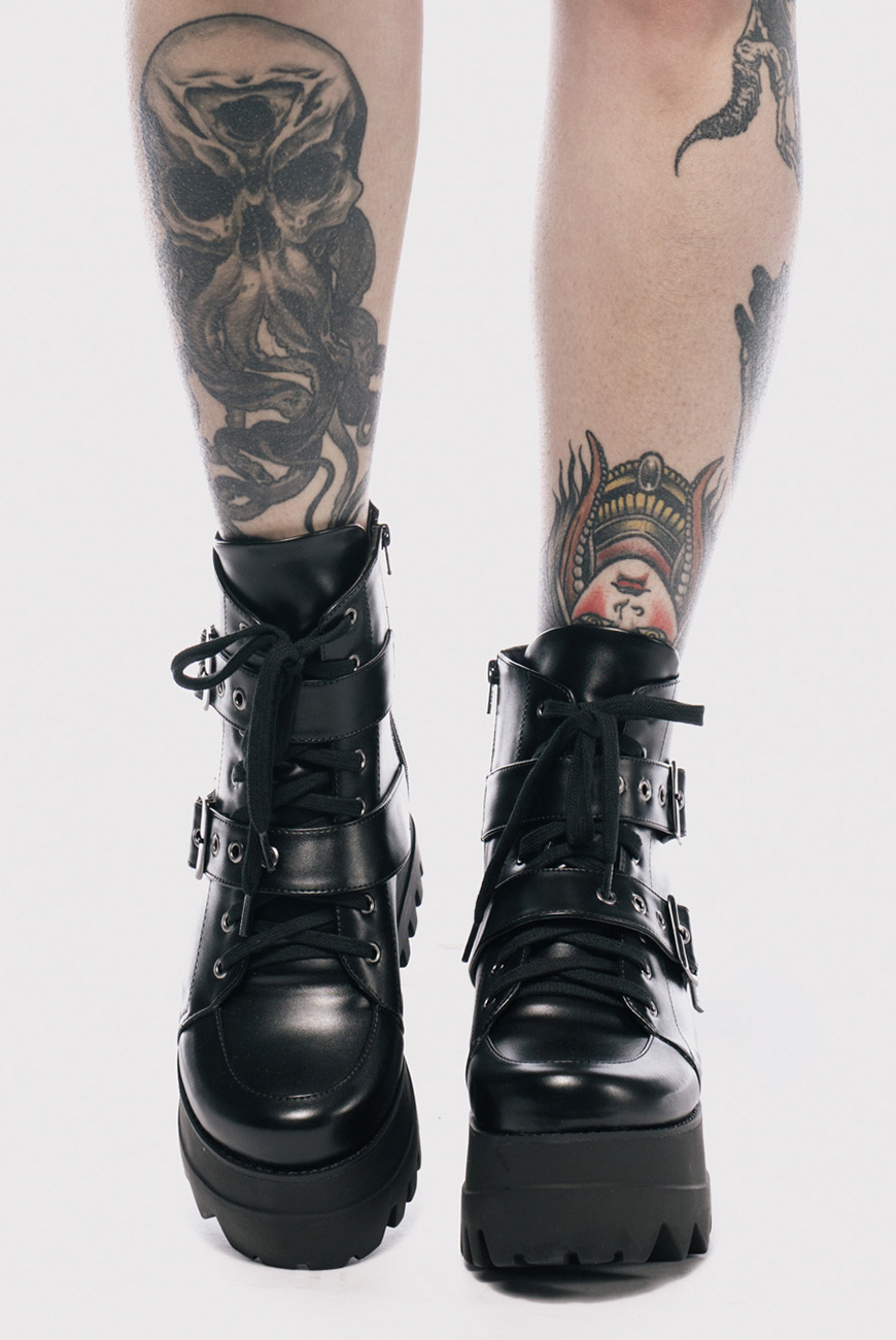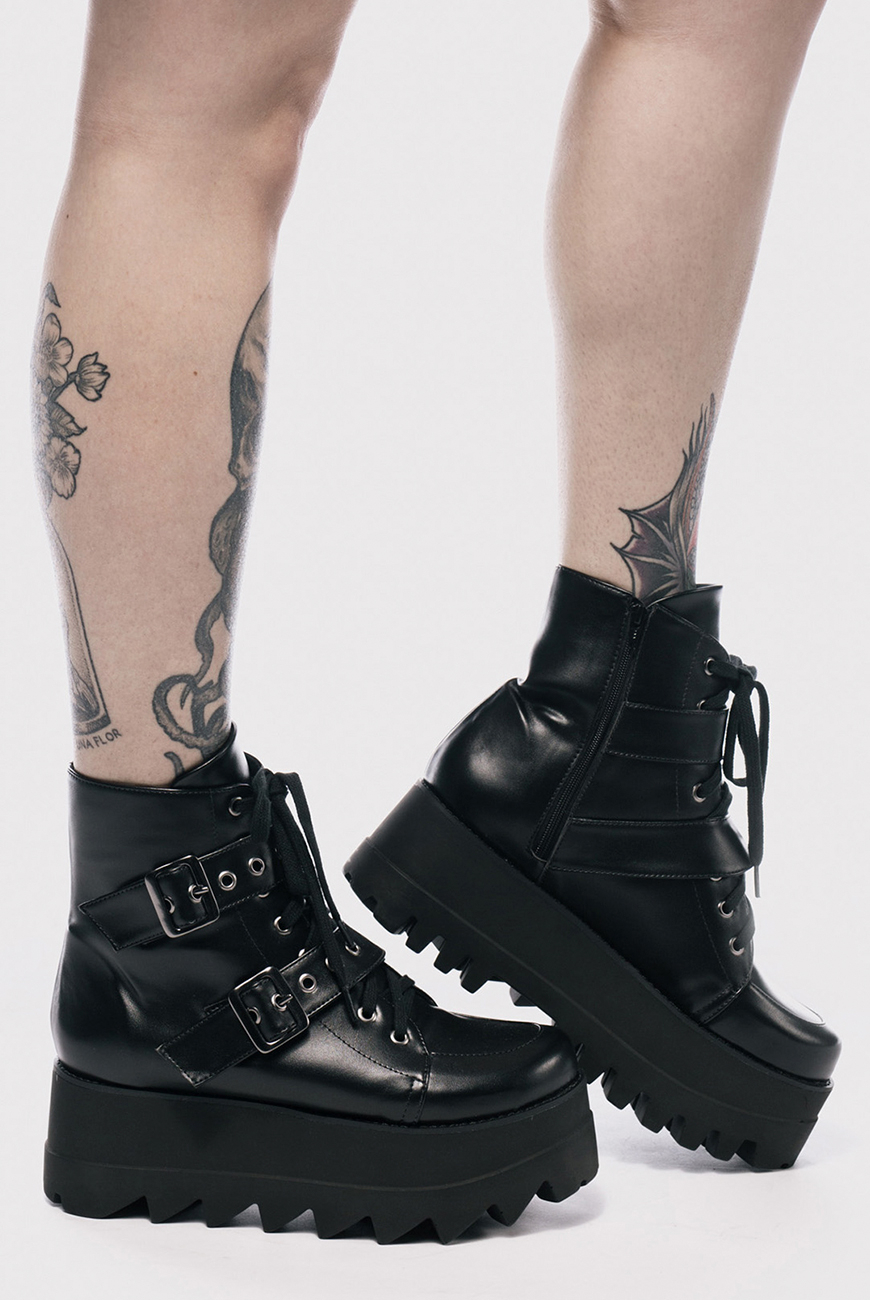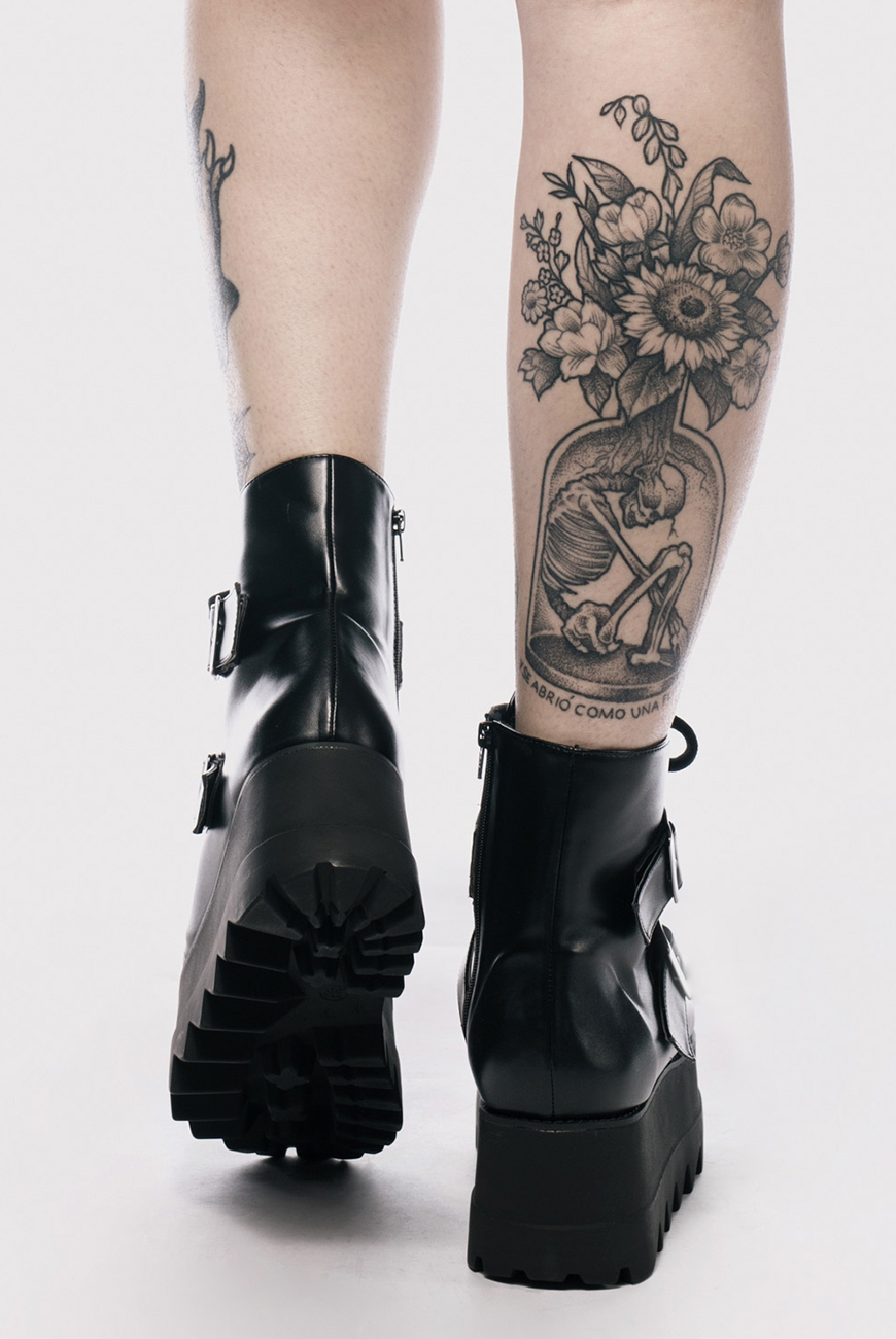 Bota de plataforma cano alto em material alternativo de origem não animal, com solado tratorado e detalhes de fivelas.