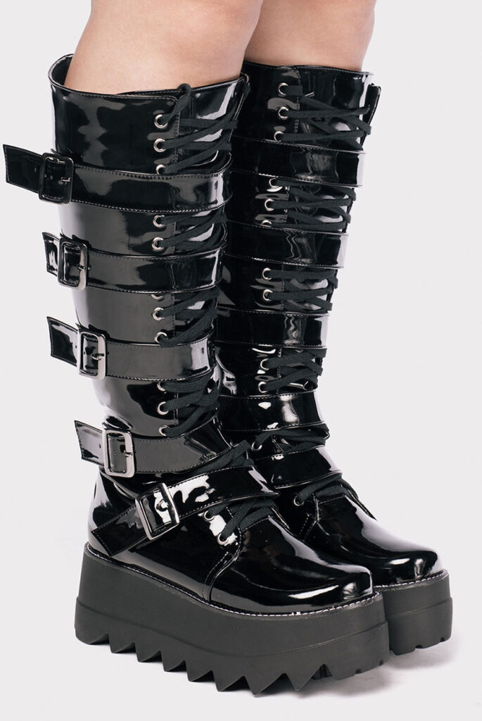 Bota de plataforma cano alto em material alternativo de origem não animal, com solado tratorado e detalhes de fivelas.