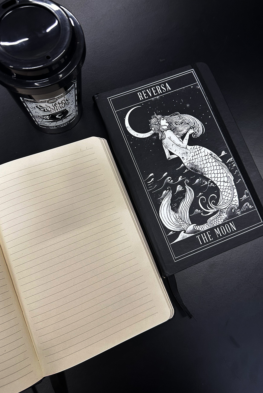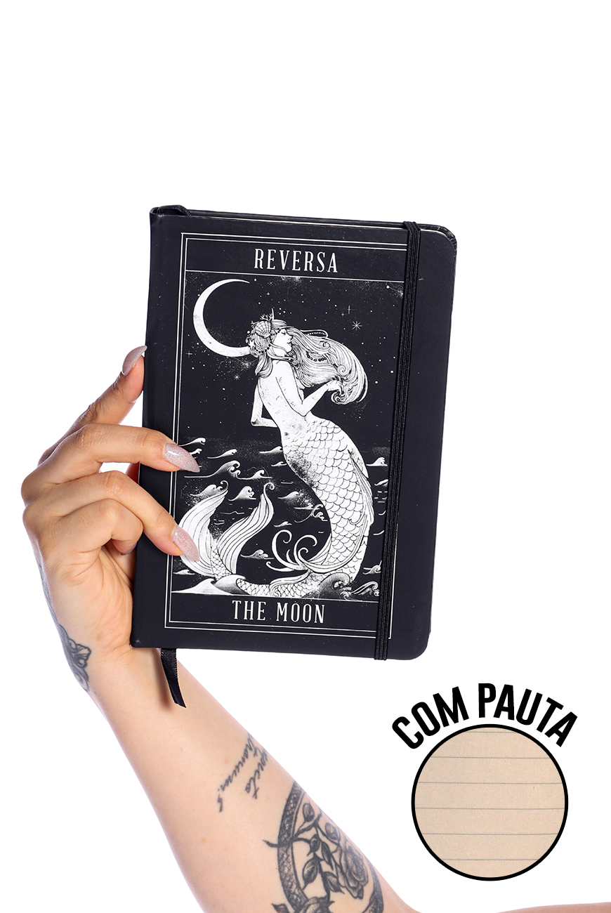 A Caderneta Pautada The Moon possui capa dura com arte exclusiva da nossa versão da carta da lua do tarot, do jeitinho místico que a gente AMA!