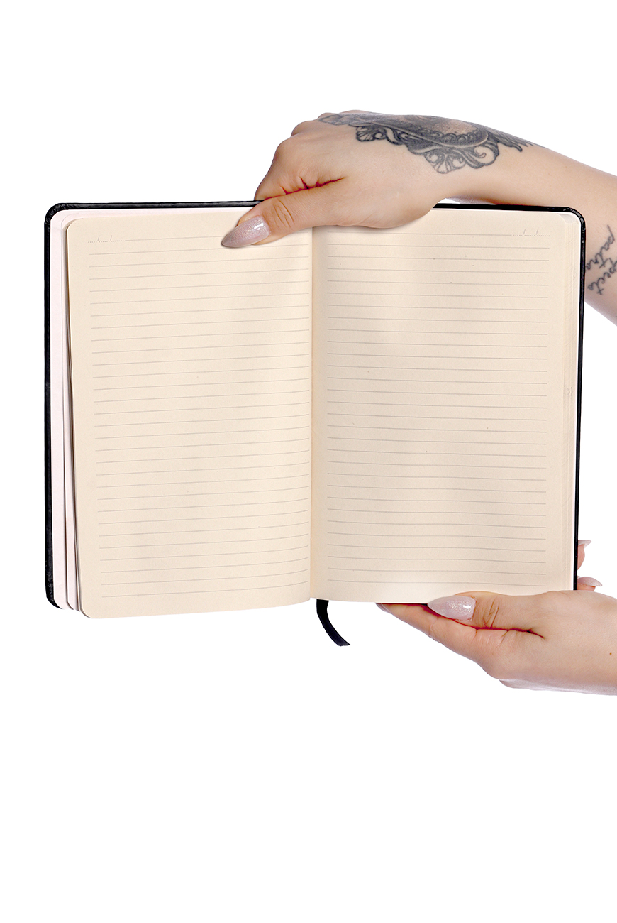 A caderneta tem os cantos arredondados, fita de cetim na cor preta para marcar páginas e elástico preto macio para fechá-la.