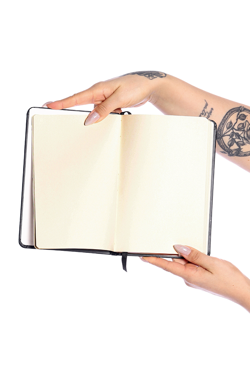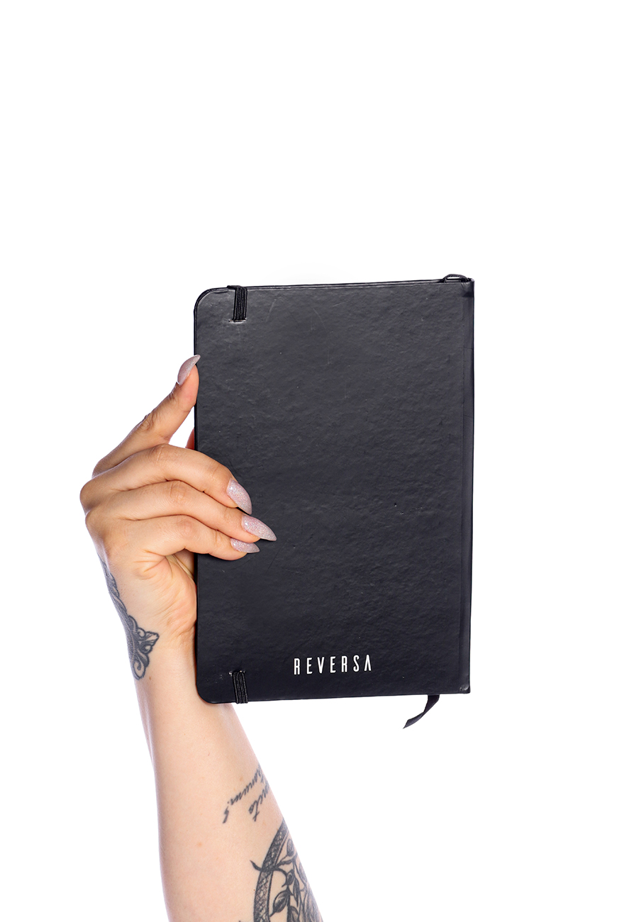 A caderneta tem os cantos arredondados, fita de cetim na cor preta para marcar páginas e elástico preto macio para fechá-la.