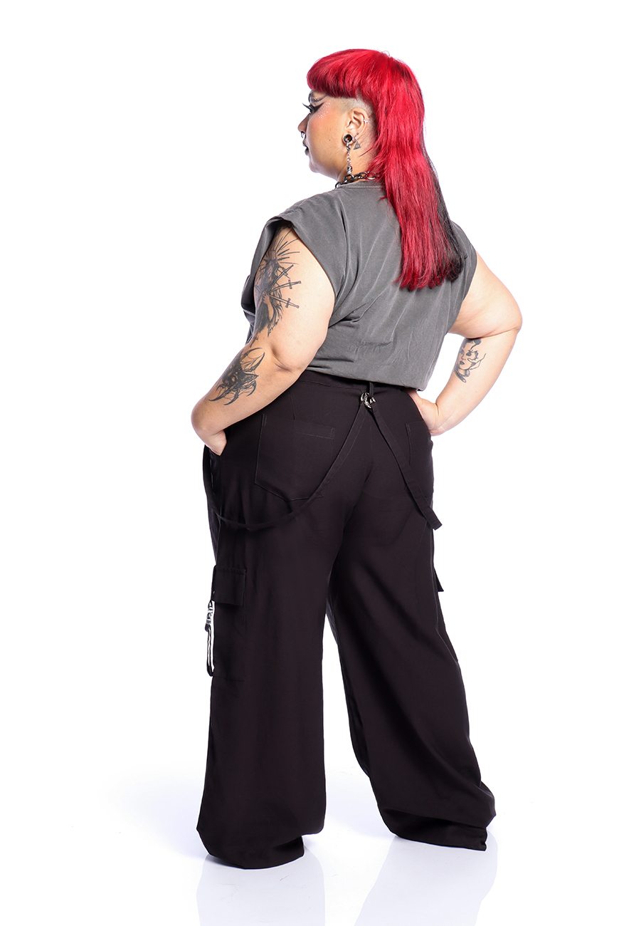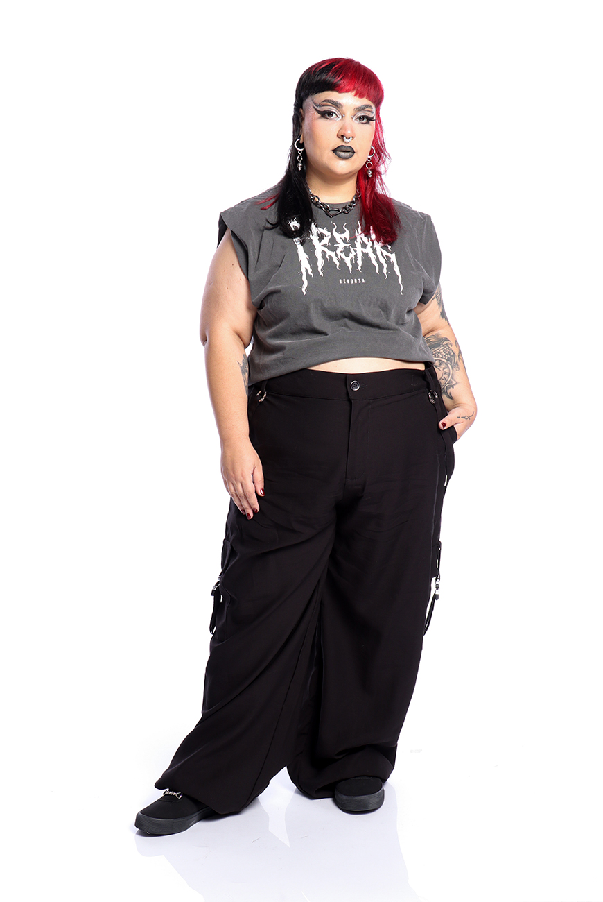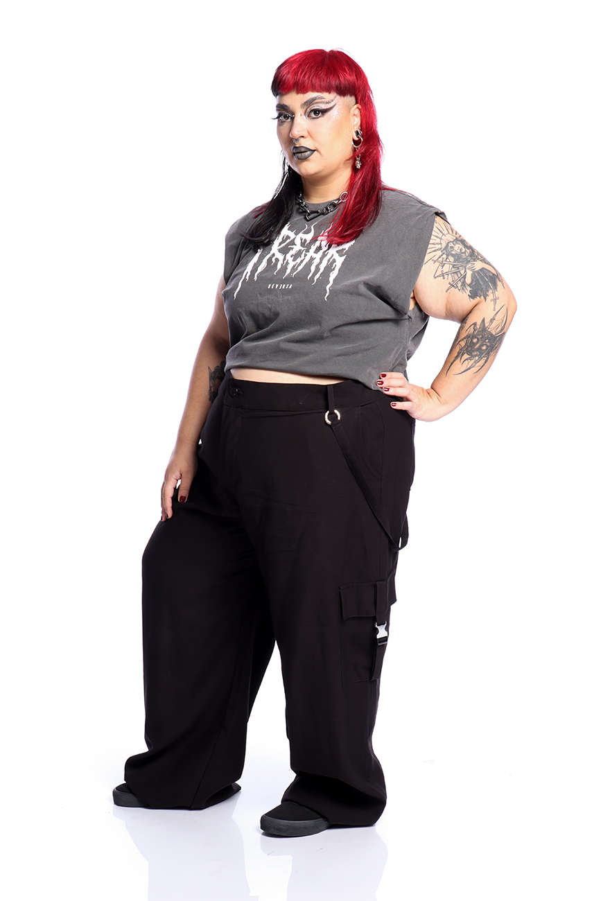 A Calça Baggy Preta Obsidian tem cintura média, podendo ser usada logo abaixo do umbigo ou cintura alta, usando um cinto. Tem caimento mais largo e é produzida em tecido de alfaiataria com viscose – super macio. Como a clássica calça baggy dos anos 2000, possui bolsos cargo nas laterais, que fecham com um engate.