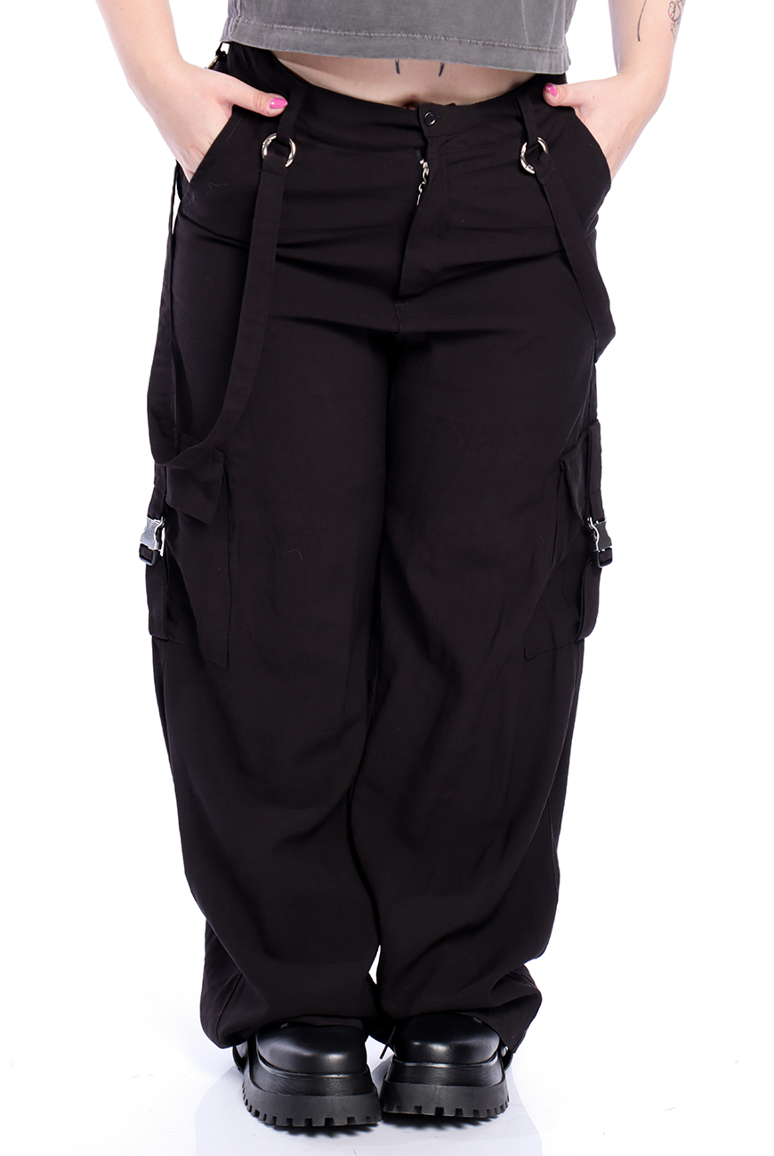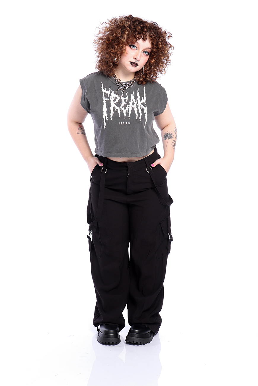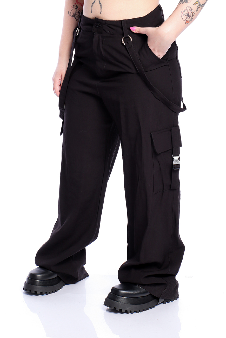A Calça Baggy Preta Obsidian tem cintura média, podendo ser usada logo abaixo do umbigo ou cintura alta, usando um cinto. Tem caimento mais largo e é produzida em tecido de alfaiataria com viscose – super macio. Como a clássica calça baggy dos anos 2000, possui bolsos cargo nas laterais, que fecham com um engate.