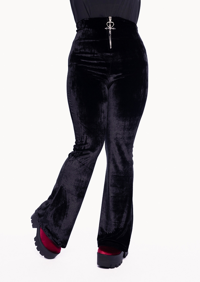 Novidade exclusiva, a calça flare é feita em veludo super confortável, veste bem e ainda possui cintura super alta que não aperta nem marca, garantindo total conforto. O tecido de veludo na cor preta é perfeito para o inverno – com brilho elegante e versátil, além de aquecer bem. O modelo ainda acompanha o puxador exclusivo Vampire Heart em banho niquelado. Combina com todos os seus looks mais trevosos para sair.