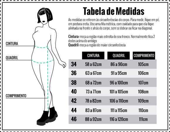 Modelo veste tamanho 38. Altura 1,63cm, Busto 88cm, Cintura 60cm, Quadril 100cm.