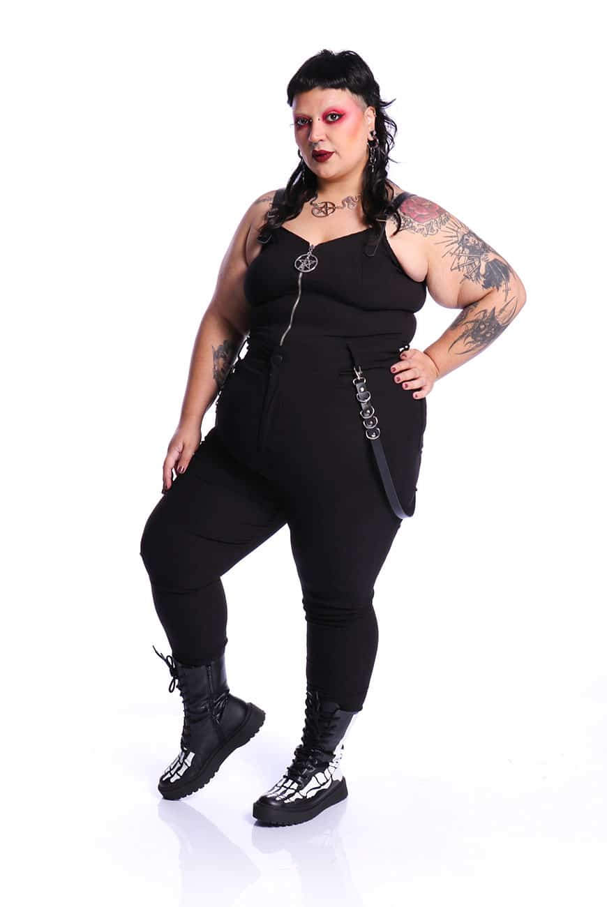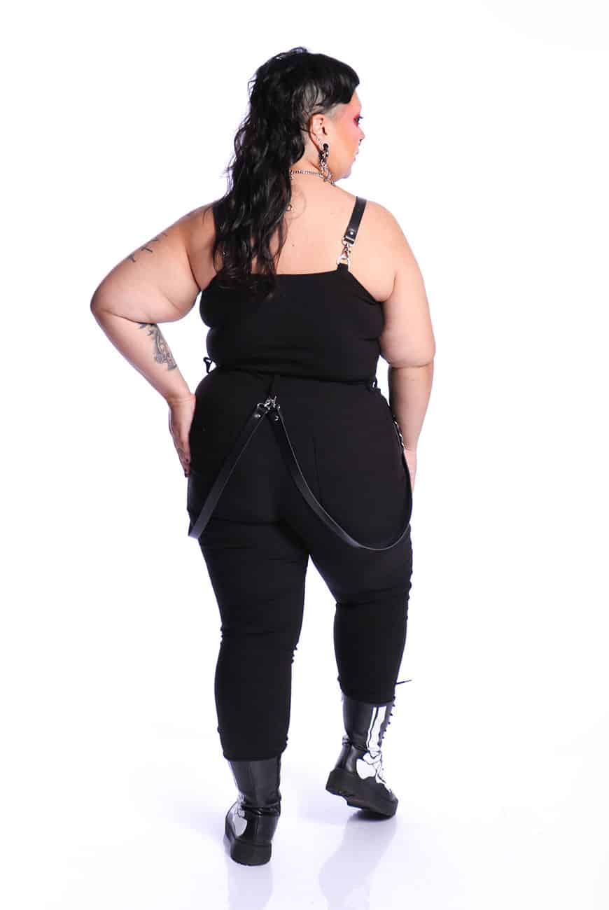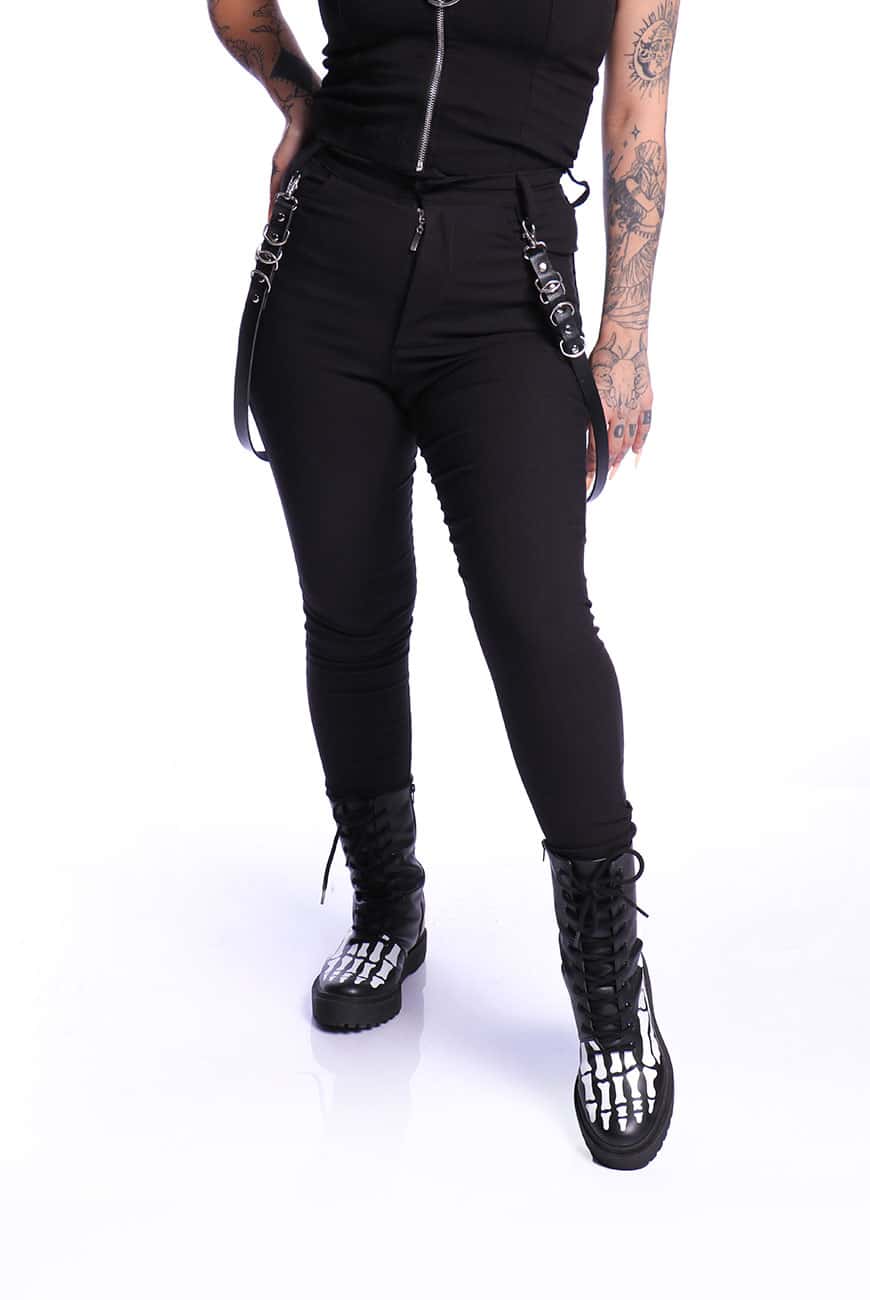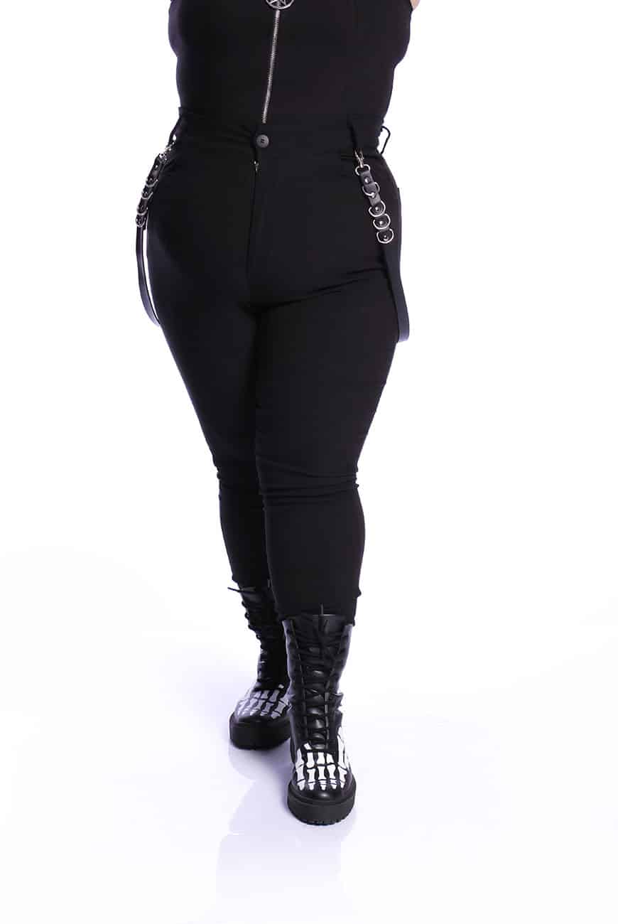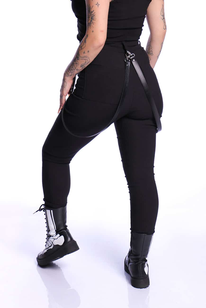 Além disso, tem o detalhe lindíssimo de duas tiras de couro com argolas fixadas nos passadores da calça, trazendo aquele visu bem alternativo e diferente! As tiras são removíveis, sendo aplicadas por mosquetões e possibilitando o uso com ou sem o acessório.