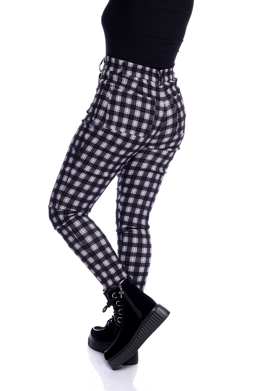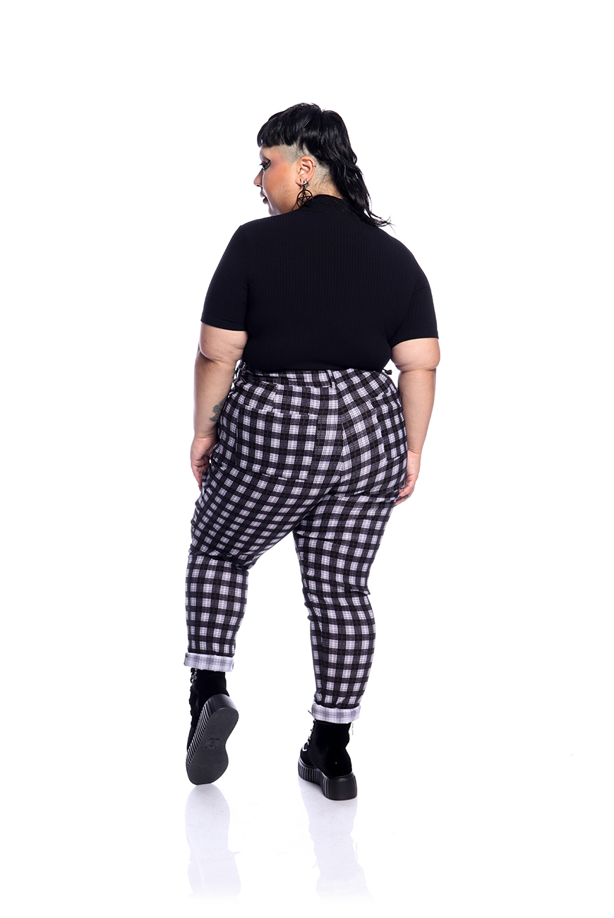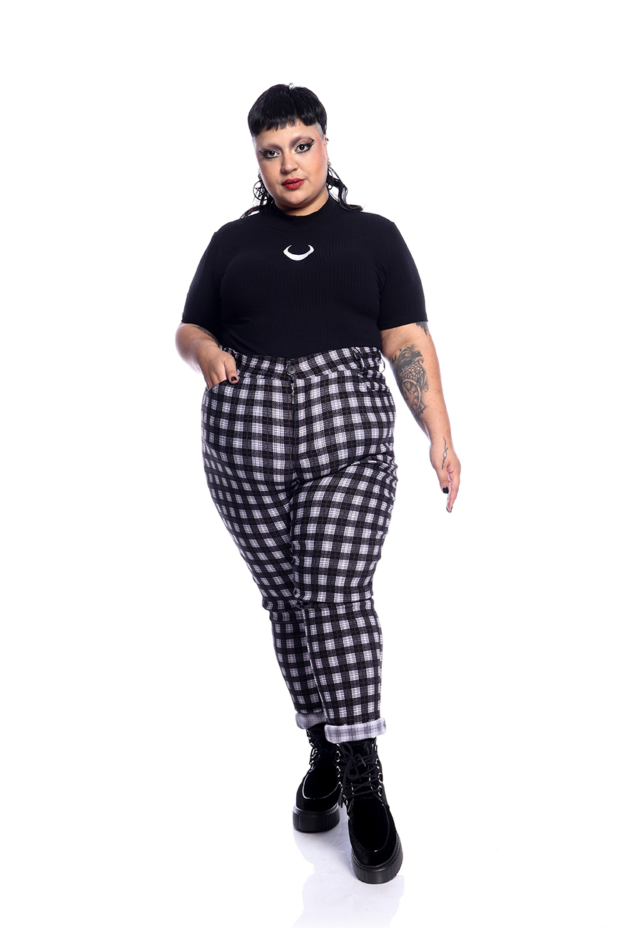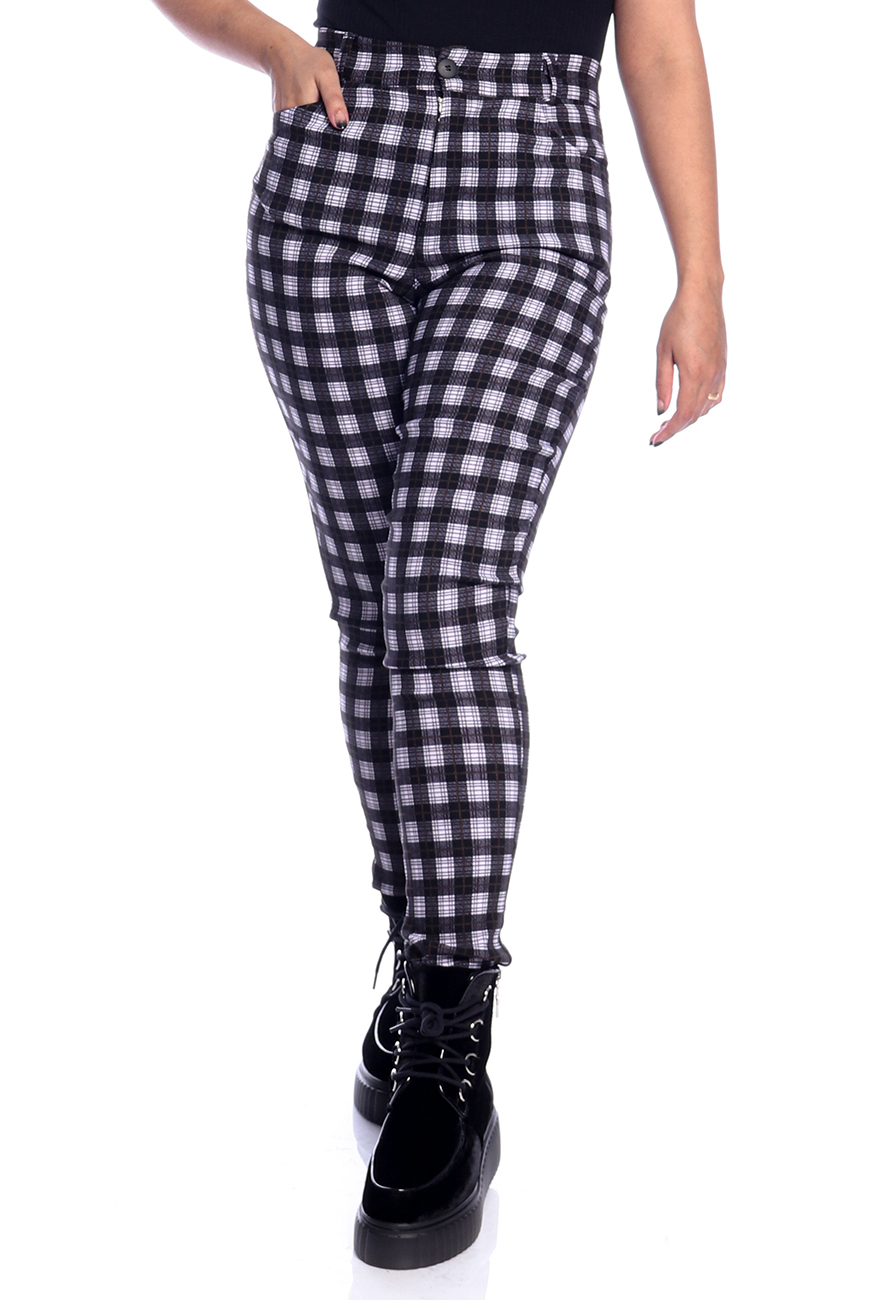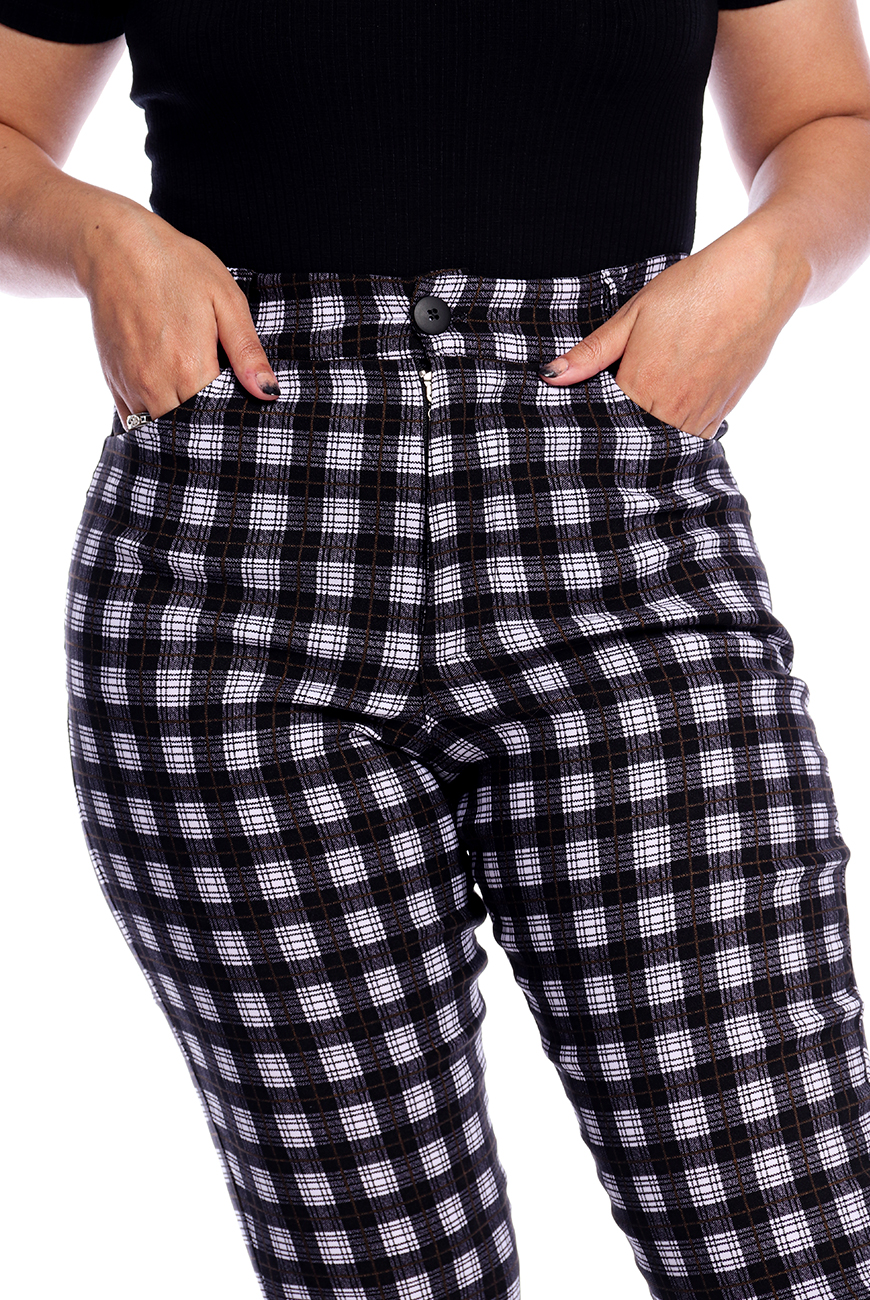 A Calça Skinny Xadrez Preto e Branco é produzida em tecido xadrez preto e branco, com alta elasticidade e maciez, sendo ideal para usar o dia todo.