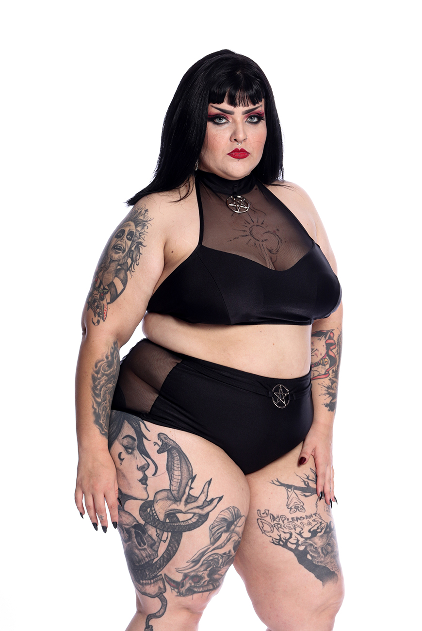 Tem detalhes de tule nas laterais, trazendo aquela transparência linda que valoriza a silhueta, e um pingente de pentagrama invertido niquelado com banho especial não oxidante para você poder aproveitar a praia, piscina e onde mais quiser sem eles perderem o brilho e a qualidade.