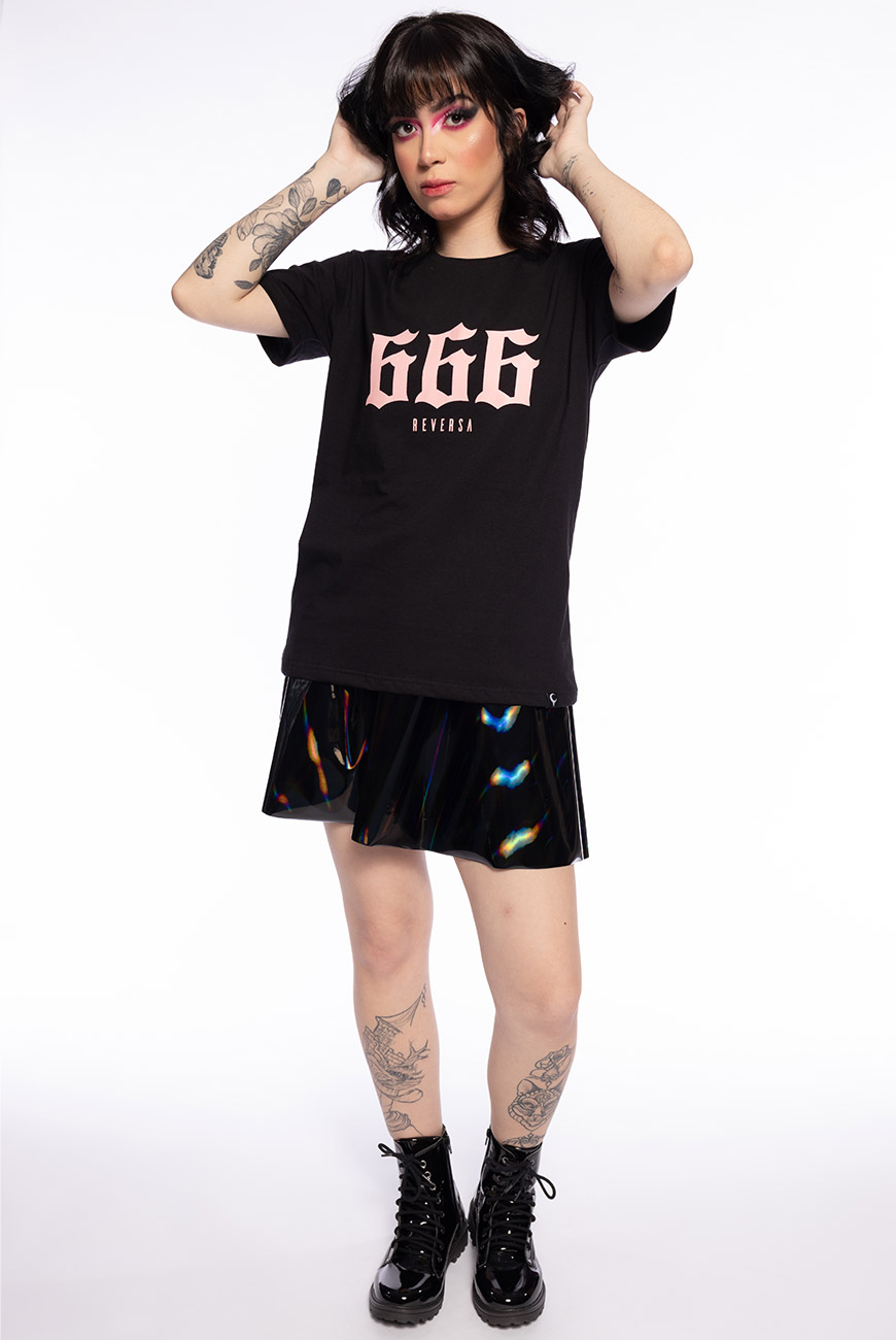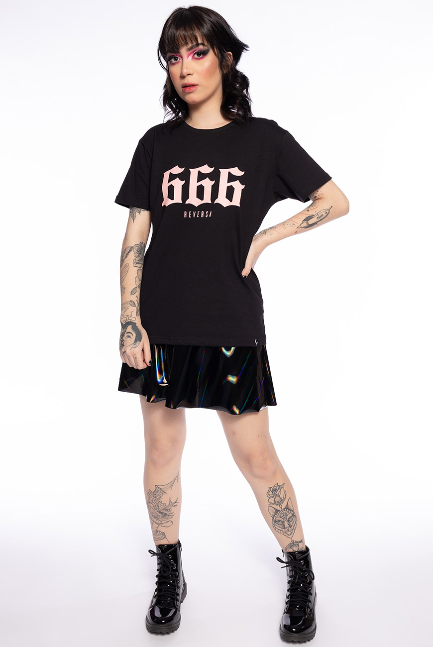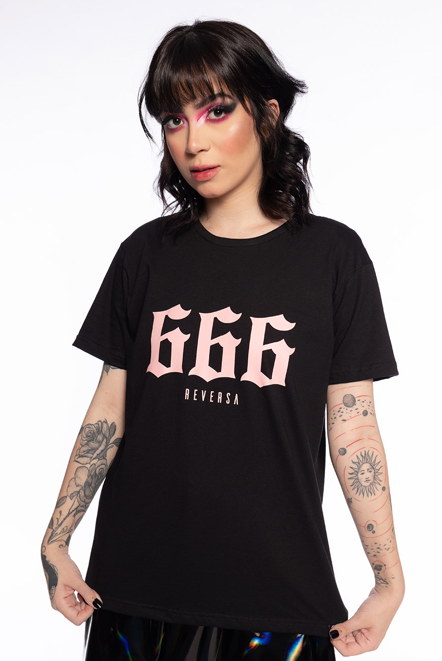 Camiseta de modelagem unissex com manga curta, possui estampa exclusiva 666 em serigrafia na cor rosê, pra você que é das trevas, mas ama aquele rosinha às quartas.