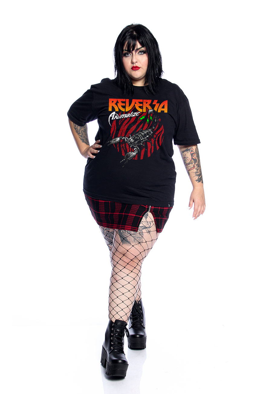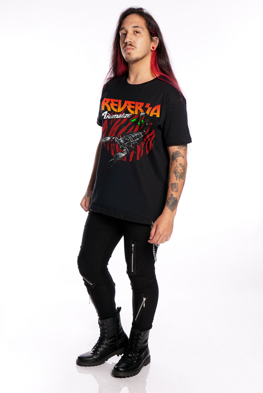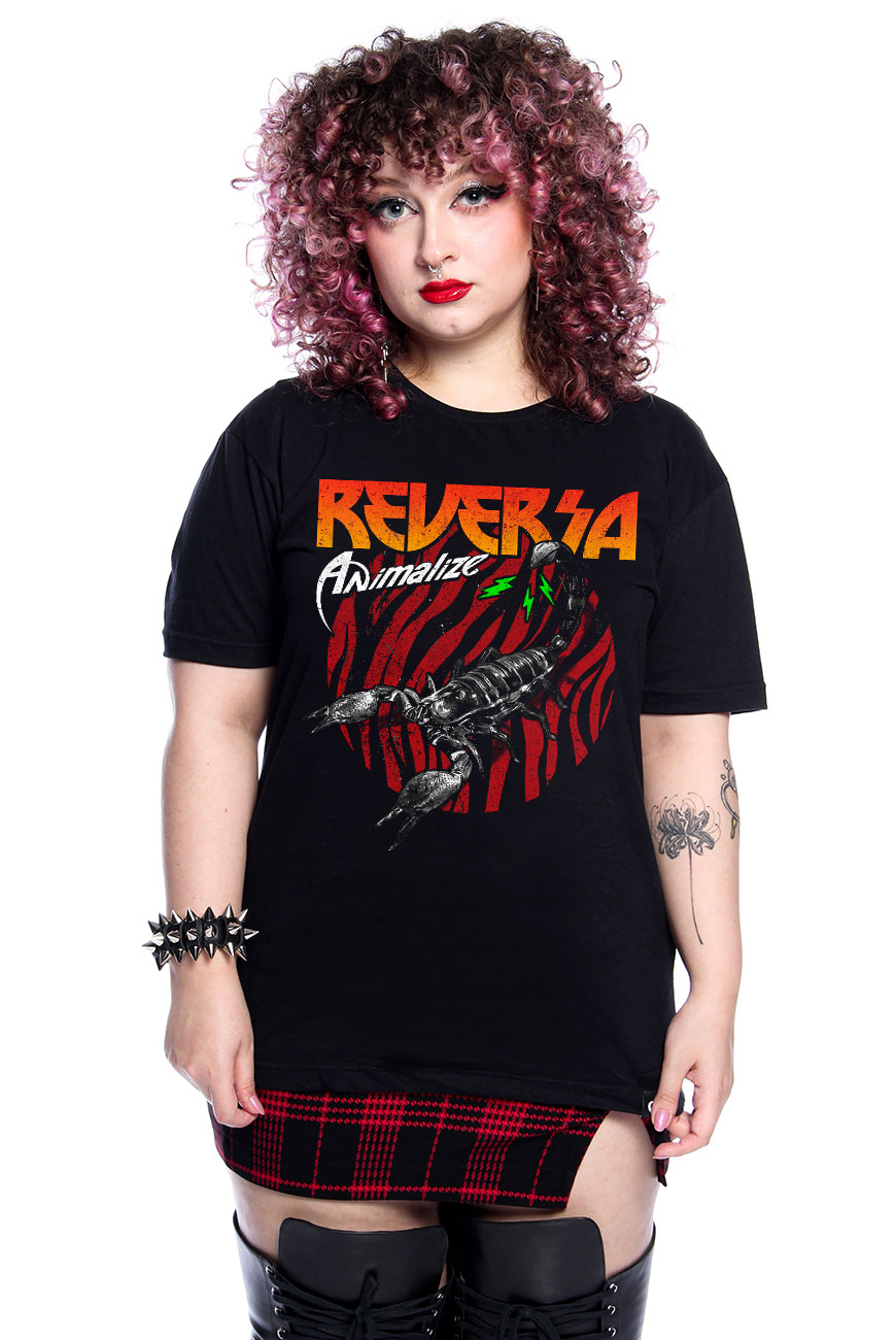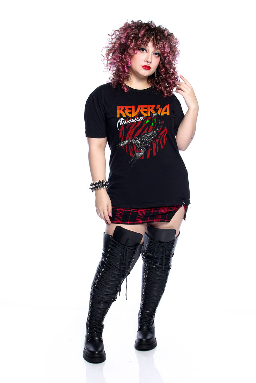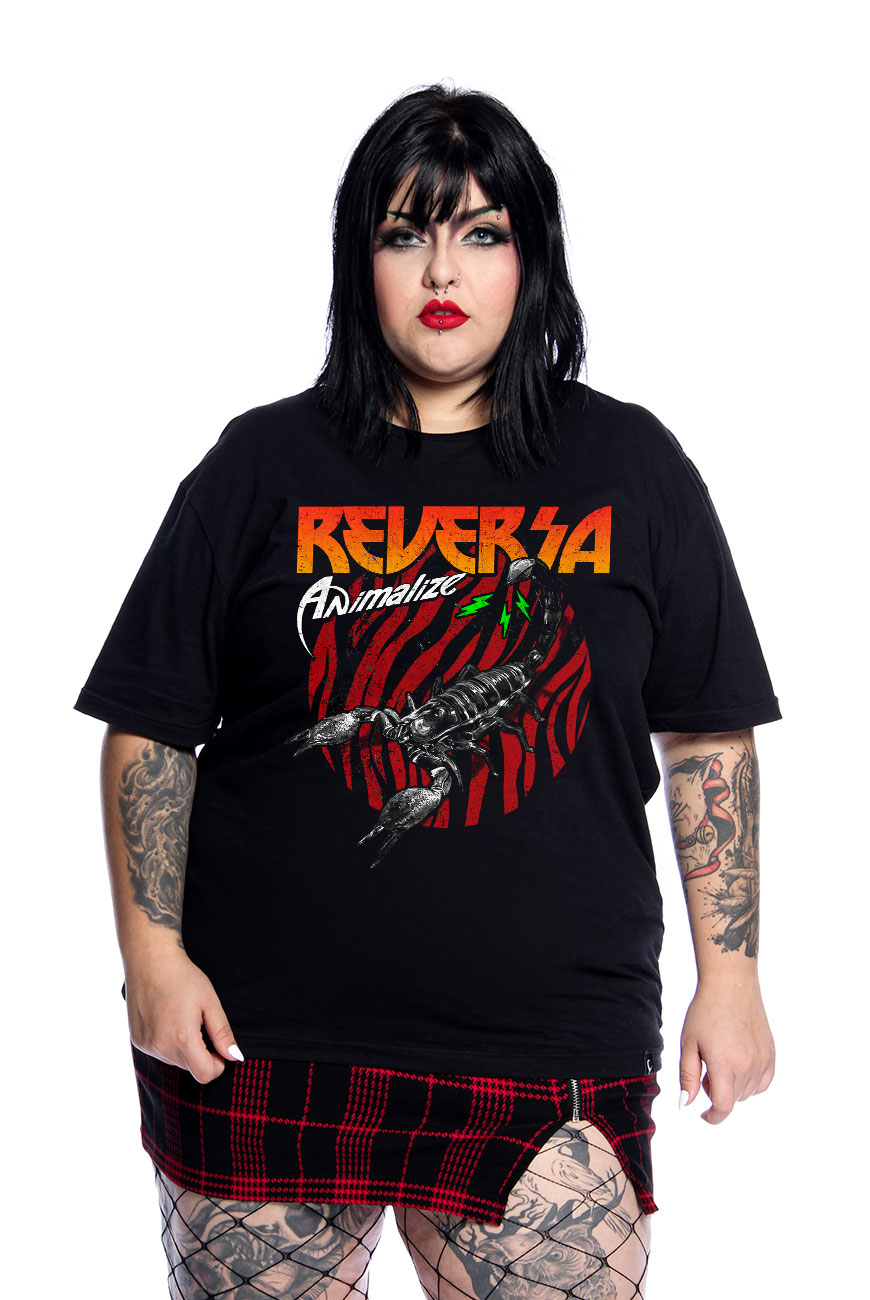 Camiseta de modelagem unissex com manga curta e estampa exclusiva Animalize feita em serigrafia, inspirado nas artes das bandas de glam rock dos anos 80.