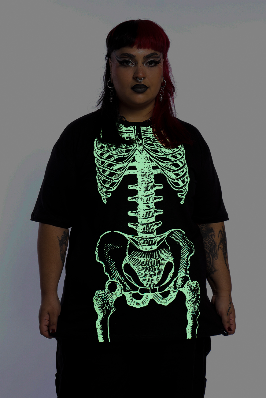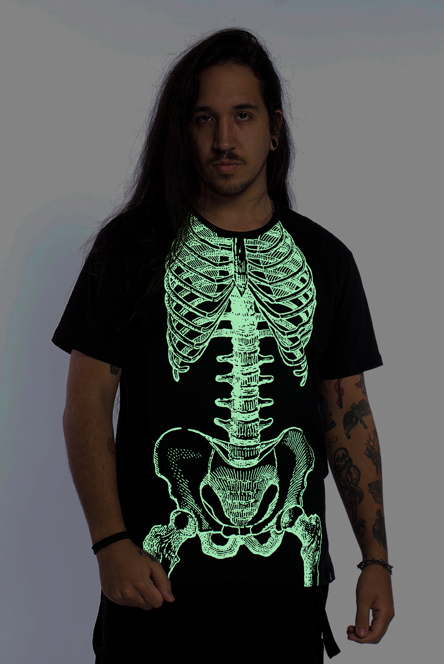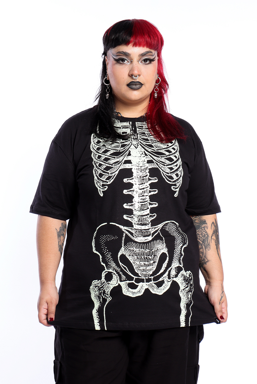 Camiseta unissex com estampa esqueleto que brilha no escuro, super estilosa! Modelo de manga curta, modelagem soltinha e estampa frontal em serigrafia.