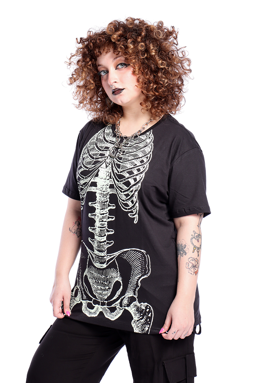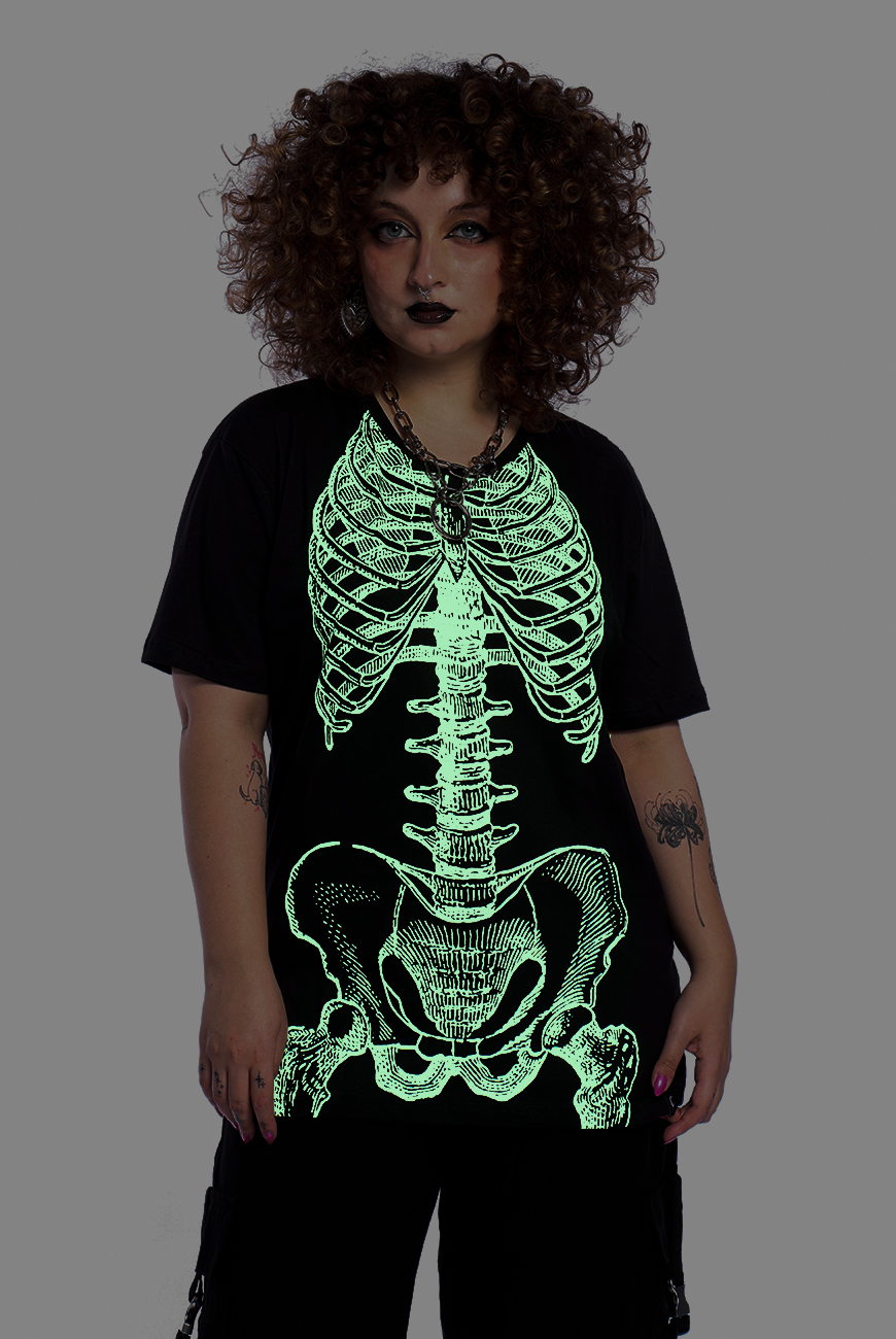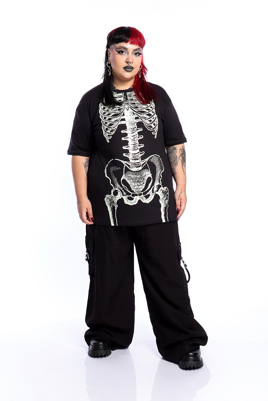 Camiseta unissex com estampa esqueleto que brilha no escuro, super estilosa! Modelo de manga curta, modelagem soltinha e estampa frontal em serigrafia.