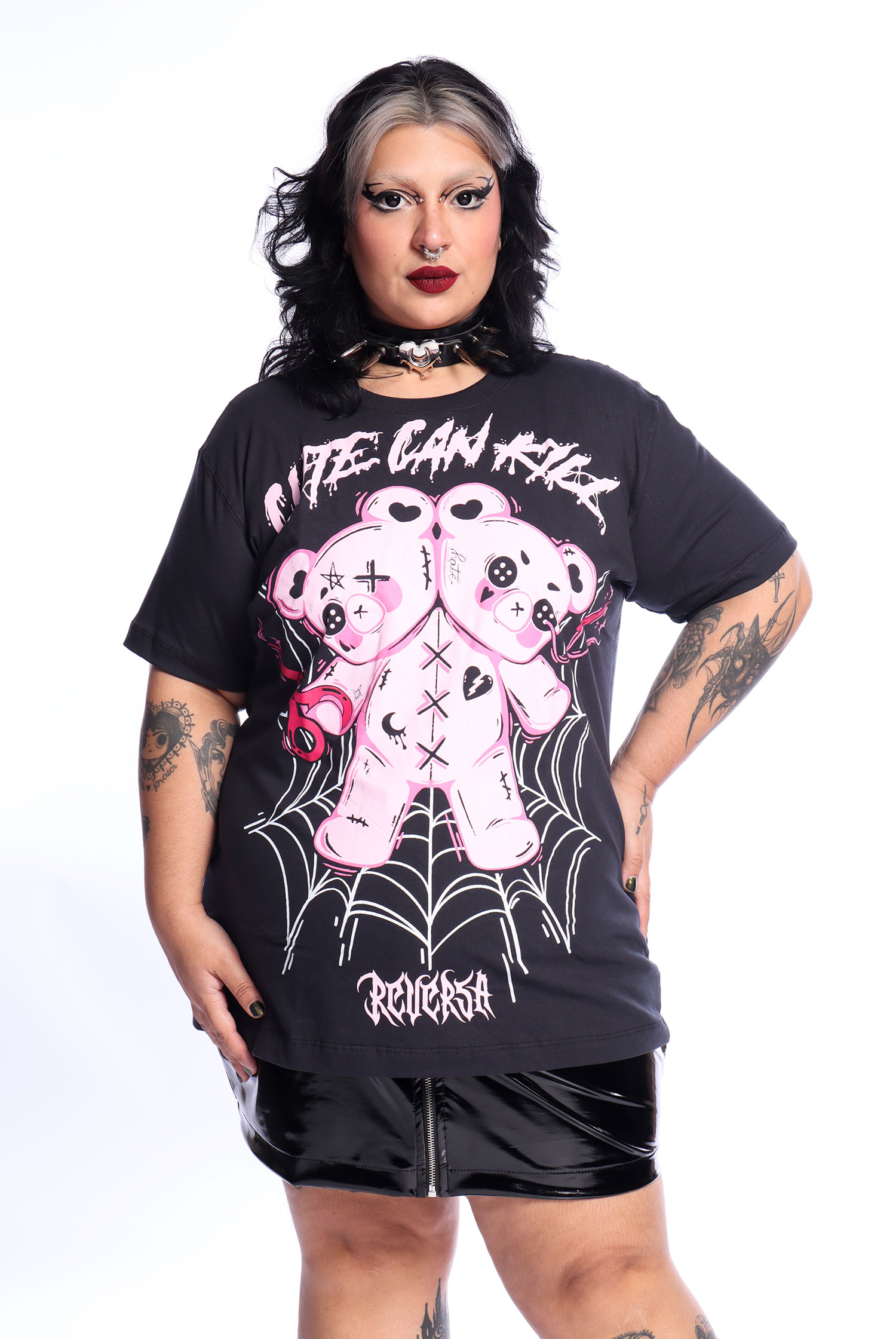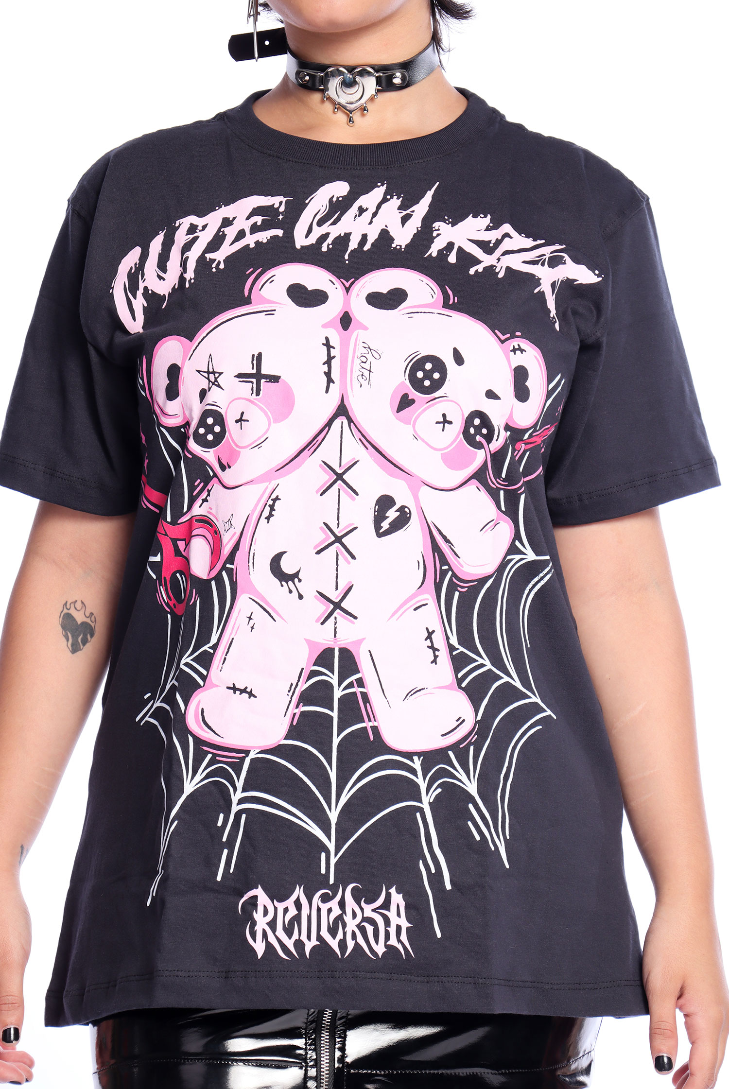 A Camiseta Unissex Cinza Cute Can Kill tem modelagem unissex, fit oversized, manga curta e estampa exclusiva Reversa, feita em serigrafia em tons de rosa perfeitos.
