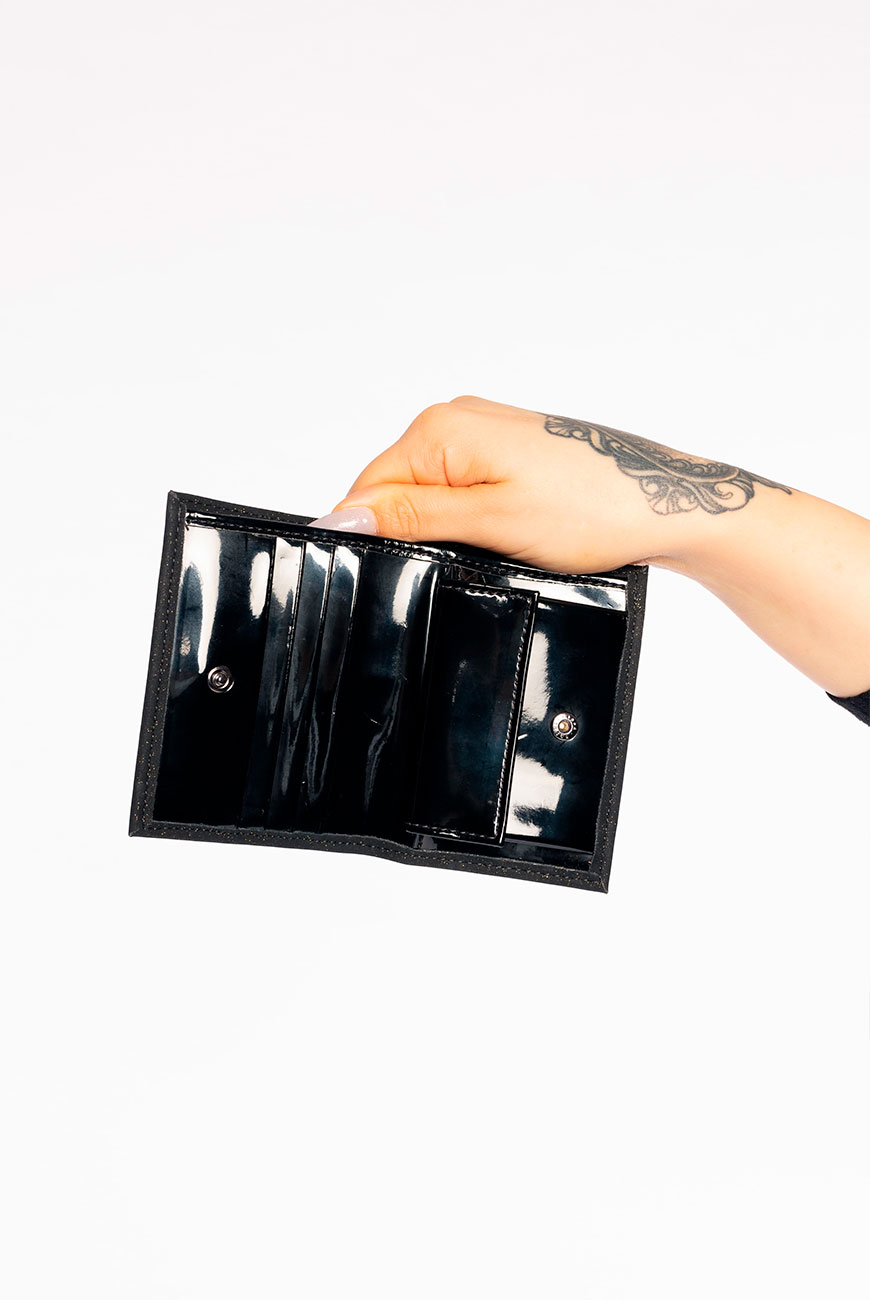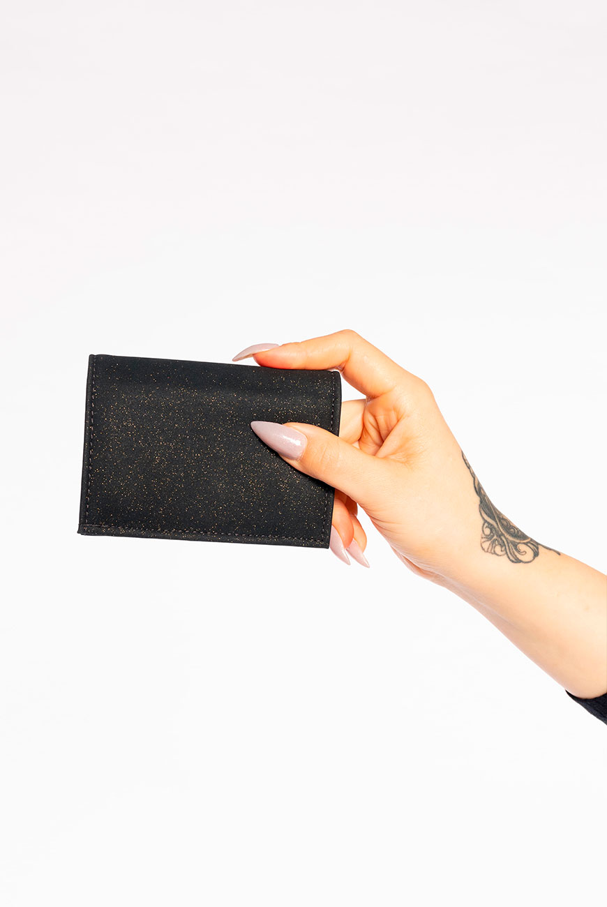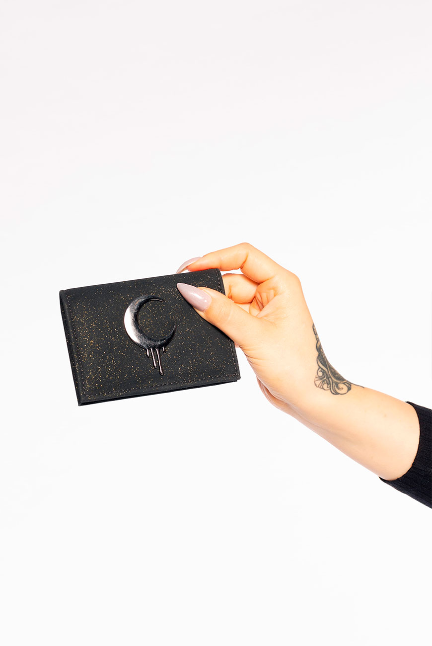 Carteira pequena produzida em napa preta com glitter e detalhe frontal lindíssimo da nossa Lua Reversa em banho ônix.